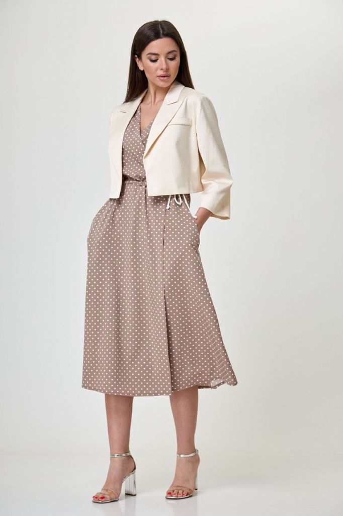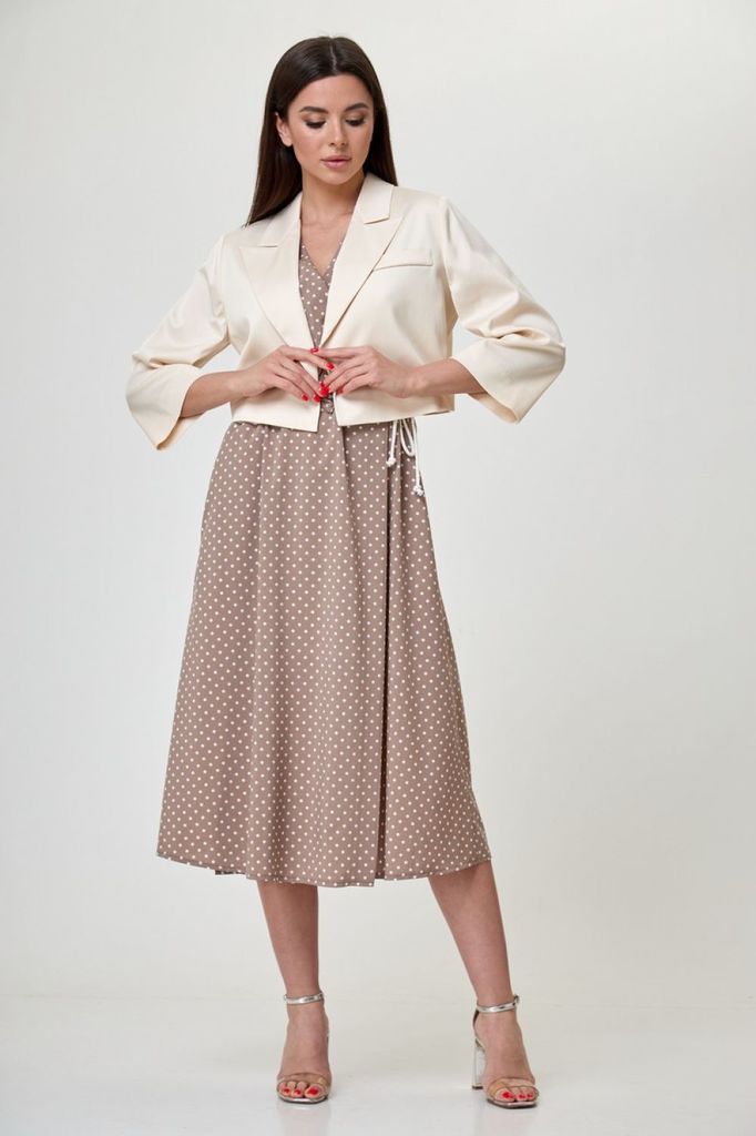 Состав: Платье- Вискоза-29%; ПЭ-71%; Жакет- Вискоза-18%; ПЭ-77%; Эластан-5%; Подкладка- Вискоза-60%; ПЭ-40%; Сезон: Весна Рост: 164 Страна бренда: Беларусь Состав: Платье: Вискоза-29%; ПЭ-71%; Жакет: ... Показать описаниеВискоза-18%; ПЭ-77%; Эластан-5%; Подкладка: Вискоза-60%; ПЭ-40%; Костюм, состоящий из платья и жакета-болеро. Платье на запах, длина ниже колен. Пройма и горловина обработаны обтачками. По линии талии кулиска, в которую протянут шнурок, для фиксации платья. Так же для этого можно использовать узкий пояс. Жакет-болеро укороченный, на подкладке, длиной до линии талии. Рукав 3/4, втачной. Горловина обработана воротником с лацконом. По переду слева декоративная листочка. Данный комплект прекрасный выбор, как для торжества, так и для ежедневного использования. В нем вы будете чувствовать себя женственно, стильно и комфортно. Вся необходимая информация о производителе указана на этикетке. Замеры: Рост фотомодели - 170 см. Размер фотомодели - 48. ОГ- объем груди; ОТ-объем талии; Об-объем бедер; ДИ-длина изделия; ДР-длина рукава. Размер 48. ОГ- 96; ОТ-78; ОБ-104; Жакет: ДИ-41; ДР -47. Платье: ДИ-118. Размер 50. ОГ- 100; ОТ-82; ОБ-108; Жакет: ДИ-41,5; ДР -47,5. Платье: ДИ-118,5 Размер 52. ОГ-104 ; ОТ-86; ОБ-112; Жакет: ДИ-42; ДР -48. Платье: ДИ-119. Размер 54. ОГ- 108; ОТ-90; ОБ-116; Жакет: ДИ-42,5; ДР -48,5. Платье: ДИ-119,5