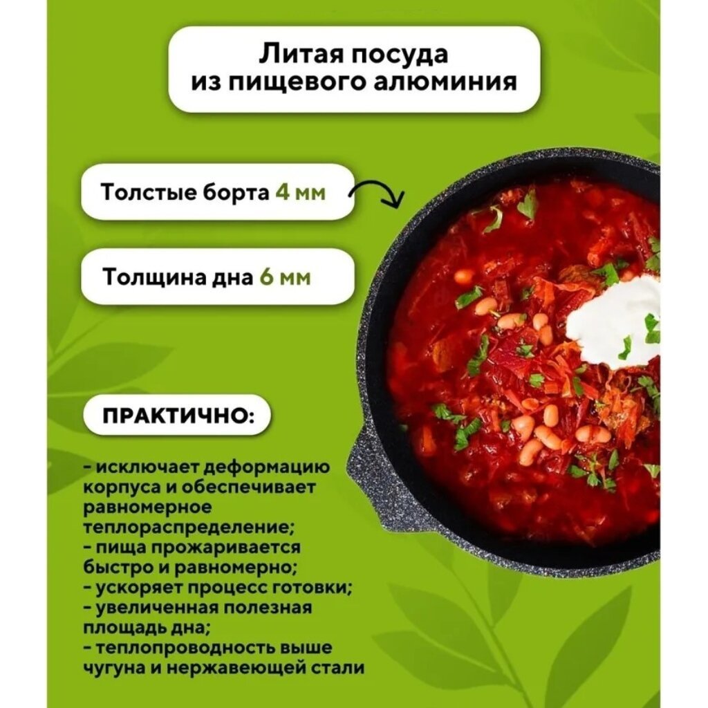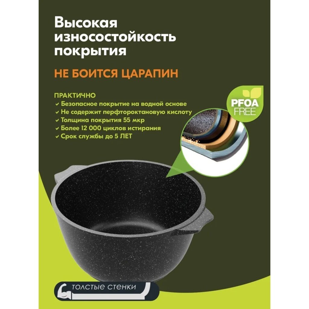 Кастрюля 4л. со стеклянной крышкой. Сверхпрочное антипригарное покрытие Greblon на водной основе без PFOA. Толщина покрытия до 55 микрон. Ресурс более 12 000 циклов. Серия "Гранит". Толщина дна 5,5-6м... Показать описанием., толщина стенок 3,6-4мм. Покрытие Greblon позволяет готовить с минимальным количеством масла, сохраняя вкусовые и полезные свойства продуктов. Литой толстостенный корпус не подвержен деформации, а утолщенное дно равномерно распределяет тепло по всей поверхности. Для газовых, стеклокерамических и электрических плит
