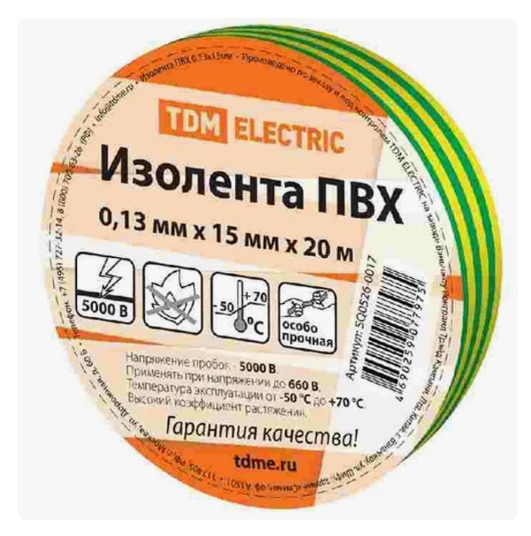 Бренд: TDM Материал: Пвх ШтрихКод: 4690259077975 Страна происхождения: Китай Изолента ПВХ  желто-зеленая 0,13х15мм  TDM 20м