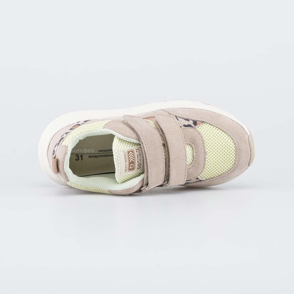 Описание Описание модели Детские кроссовки для девочки отлично подходят для активных прогулок весной или осенью. Верх этих бежевых кроссовок выполнен из гипоаллергенной и дышащей натуральной кожи-велю... Показать описаниера и украшен анималистичным принтом. Мягкий текстильный язычок из сетчатого материала повышает воздухопроницаемость детской обуви. Кожаные кроссовки с подкладкой их натурального хлопка обеспечивают здоровый микроклимат для детских ножек. Формованная основа съемной хлопковой стельки мягко амортизирует и поддерживает стопу. Кроссовки на липучках легко отрегулировать по подъему, ребенку удобно обуваться самостоятельно. Модная утонченная подошва из резины обеспечивает амортизацию при ходьбе и образует наплыв на носочную часть, защищая ее от повреждений. Обувь для детей имеет анатомически правильную конструкцию: задник необходимой жесткости, приподнятость пяточной части, округлый носок. Для поддержания внешнего вида светлой обуви рекомендуем обрабатывать её защитными спреями и чистить мягкой щеткой. Сделано в России.