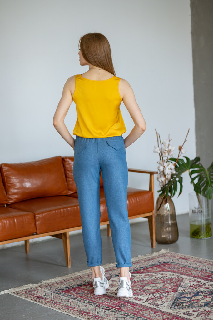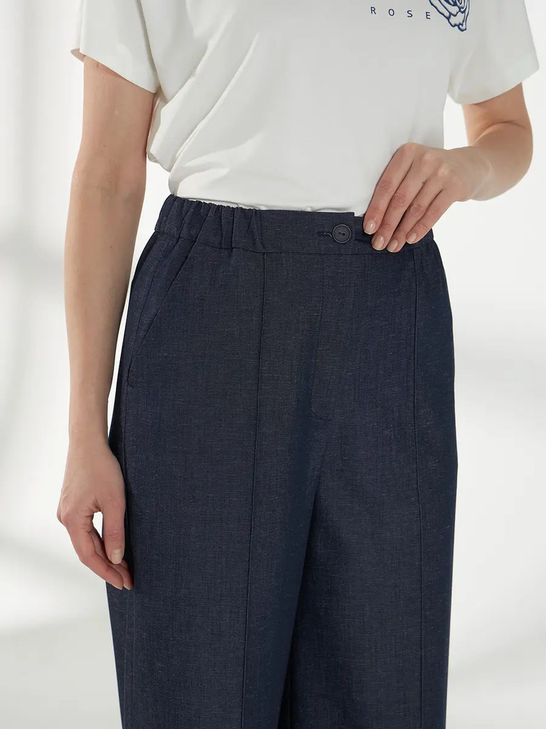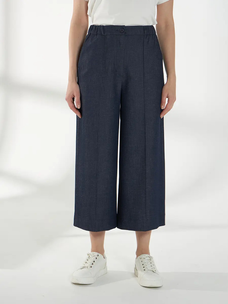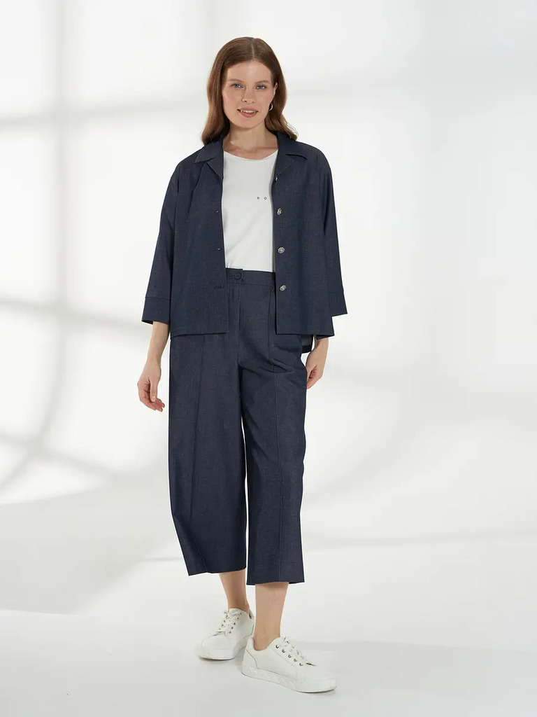 Брюки-кюлоты свободного силуэта из ткани с эффектом денима. Укороченная длина и расширенный книзу силуэт создают современный и лаконичный образ. Застежка-гульфик. Предусмотрены удобные боковые карманы... Показать описание. Спереди отсрочена стрелка, которая визуально вытягивает силуэт и сохраняет аккуратную форму в течение дня. В поясе на спинке вставлена резинка для безупречного прилегания. На фото брюки представлены с блузкой Д-2037 ДКС(В6) и джемпером С-34 РОУ(В6).