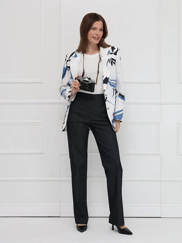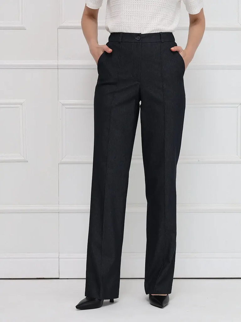 Брюки из хлопкового материала, в актуальном оттенке темного денима, станут универсальной основой гардероба. Классическая посадка и застроченная стрелка спереди формируют аккуратный, вытянутый силуэт. ... Показать описаниеМодель оснащена застежкой-гульфиком, боковыми карманами и шлевками для ремня, а комфортная резинка на поясе сзади обеспечивает идеальную посадку и свободу движений. Такие брюки легко впишутся в повседневные и городские образы. На фото брюки представлены с джемпером С-69 ПТН(В6) и жакетом В-990 ГЛШ(В6).