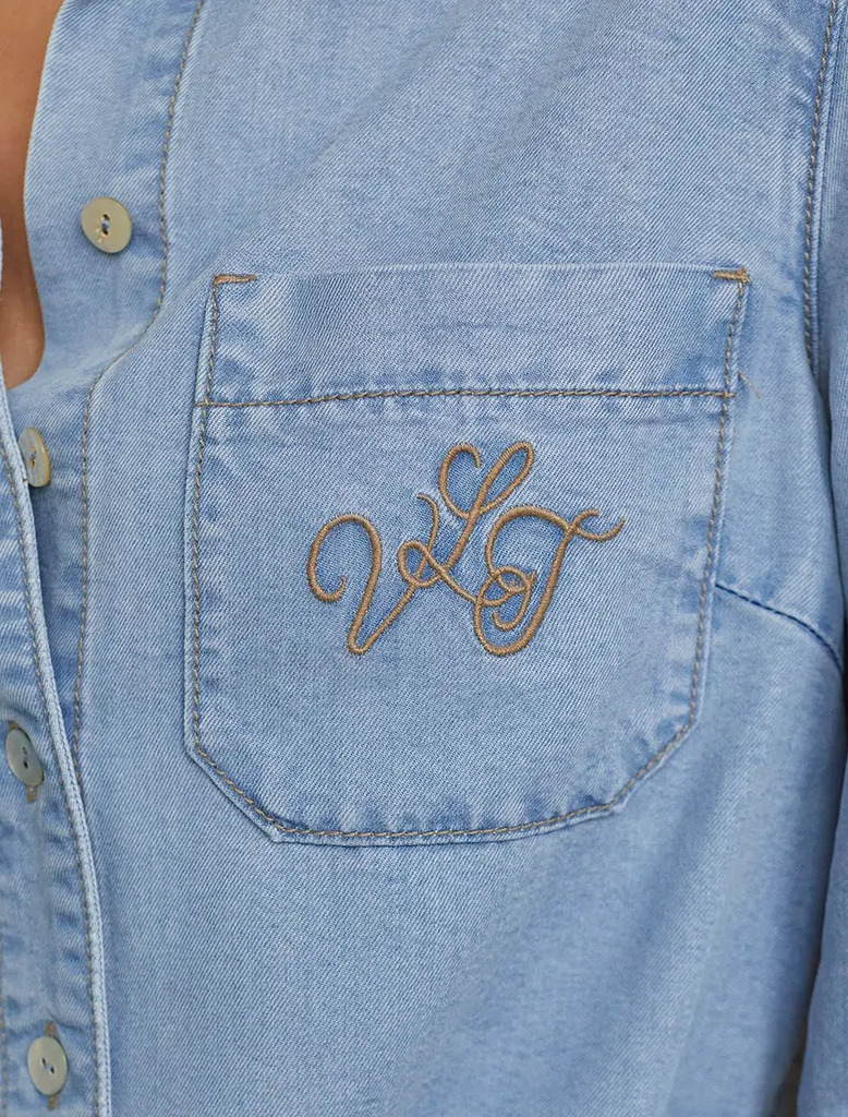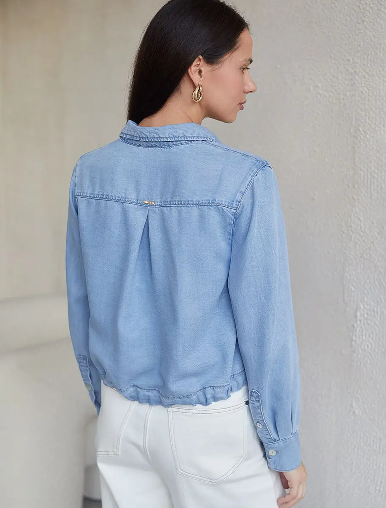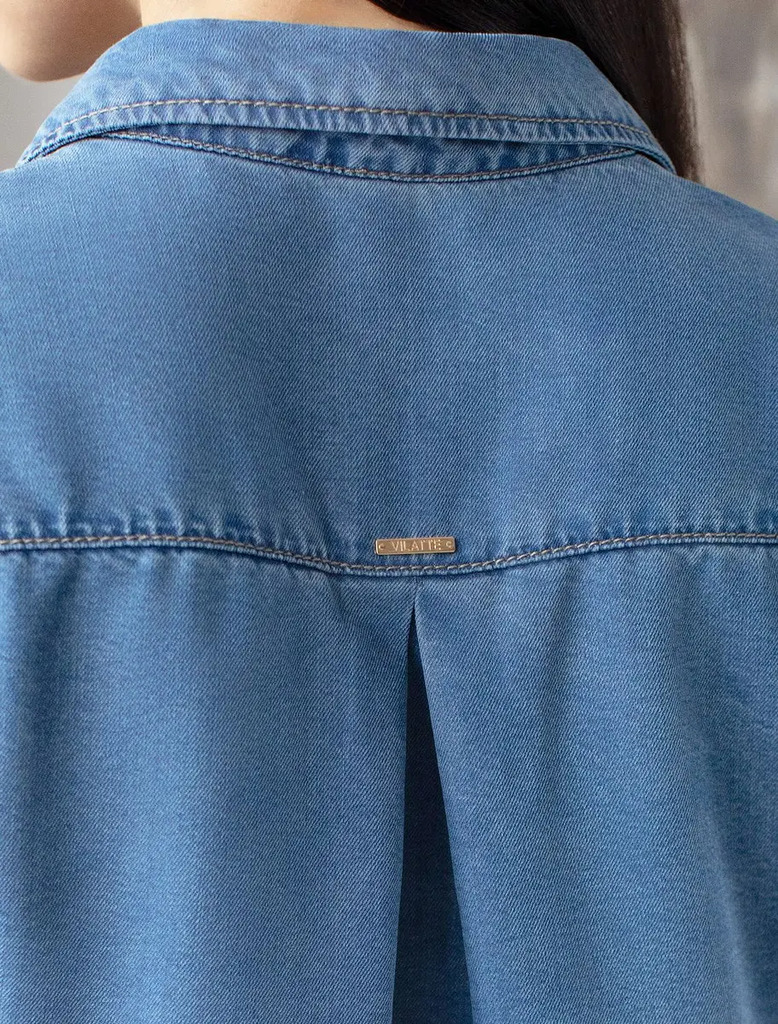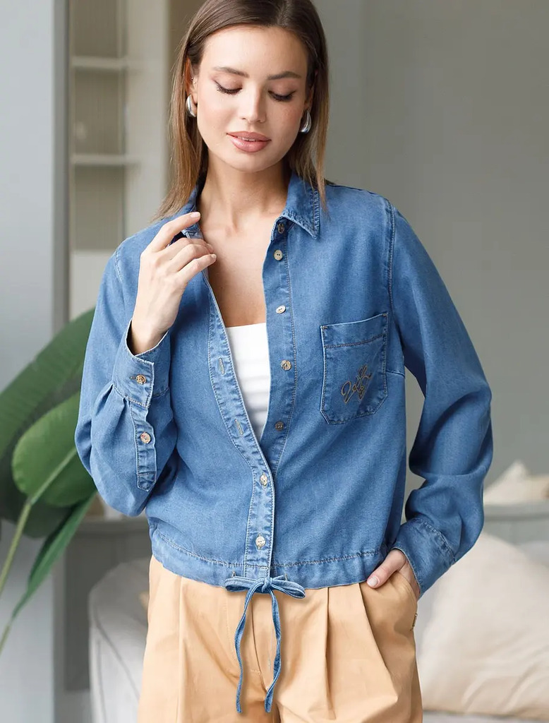 Укороченная стильная блузка светло-синего цвета с кулиской по низу выполнена из мягкого джинсового лиоцелла плотностью 7,8 OZ, который отлично держит форму и обеспечивает комфортную посадку на любую ф... Показать описаниеигуру. Кулиска сформирует красивый силуэт, позволяя легко регулировать длину по желанию и подчеркнет достоинства фигуры, не стесняя движений. Короткая джинсовая рубашка на пуговицах с отложным воротником придаст образу стильный и современный вид. Практичная деталь — карман на груди с аккуратной вышивкой в виде логотипа бренда - украшает изделие. Ткань сочетает прочность и мягкость лиоцелла с вискозой, что делает ее невероятно комфортной, дышащей, устойчивой к сминанию и идеально подходящей для чувствительной кожи. Благодаря нежным тактильным ощущениям, будто шелк, от которого ощущается приятная прохлада, рубашка отлично подходит для создания легких летних образов или стильных ансамблей на каждый день засчет своей универсальности. Длинный рукав гарантирует свободу движений и удобство на весь день. Джинсовую блузку можно сочетать в стиле кэжуал, а также создавать монохромные образы или добавлять яркие акценты с помощью аксессуаров. Эта джинсовая рубашка на пуговицах станет базовым элементом гардероба для тех, кто ценит сочетание моды и удобства. Рекомендуем сочетать с артикулами: D54.257, D56.127, D54.239