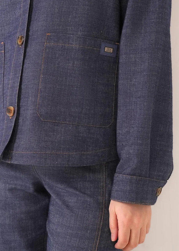 Жакет прямого силуэта из текстильного полотна джинс, с застежкой на пуговицы. По горловине отложной воротник. Спереди накладные карманы, нашивка. Длинный втачной рукав, по низу манжет с пуговицей. По ... Показать описаниепереду и спинке кокетка, сзади встречная складка.