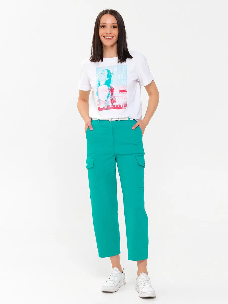 Брюки карго из джинсы.. Спереди карманы в подрезных бочках. Сзади кокетки, рельефы и декоративные клапаны с застежкой на пуговицу. По бокам накладные карманы с клапаном и застежкой на пуговицу. Брюки ... Показать описаниедекорированы отделочными строчками. Ремень в комплект не входит. Внимание! В реальности цвет может отличаться от представленного на фото ввиду различной цветопередачи устройств просмотра.