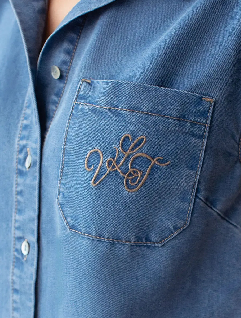 Стильная блузка светло-синего цвета на пуговицах выполнена из джинсового лиоцелла плотностью 7,8 OZ, что придает ей легкость и комфорт в носке. Эта повседневная блузка оснащена цельнокроеным коротким ... Показать описаниерукавом и отложным воротником, создавая аккуратный и современный образ. На груди расположен карман, дополненный изящной вышивкой в виде логотипа бренда, которая добавляет уникальности и выразительности изделию. Ткань сочетает прочность и мягкость лиоцелла с вискозой, что делает ее невероятно комфортной, дышащей, устойчивой к сминанию и идеально подходящей для чувствительной кожи. Благодаря нежным тактильтным ощущениям, будто шелк, от которого ощущается приятная прохлада, рубашка отлично подходит для создания легких летних образов или стильных ансамблей на каждый день засчет своей универсальности и практичности. Цельнокроеный рукав гарантирует свободу движений и удобство на весь день. Эта джинсовая рубашка на пуговицах станет базовым элементом гардероба для тех, кто ценит сочетание классики и модных деталей. Рекомендуем сочетать с артикулами: D54.257, D56.127, D54.239
