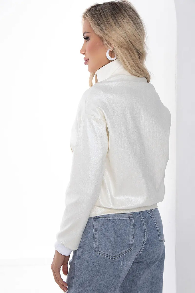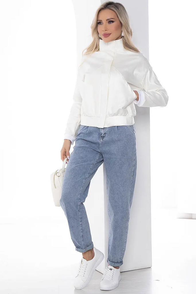 Внимание! Отличаются пуговицы. Просьба обратить внимание на последнее фото. Состав: 100% п/э. Цвет: жемчужный. Вид застежки: кнопки. Силуэт: прямой. Карманы: есть. Тип горловины: стойка. Длина изделия... Показать описание по спинке: 44-52/ 58 см. Длина рукава: 44-52/ 65 см. Рост модели: 168 см. Стильный универсальный укороченный бомбер со спущенной линией плеча, длинным рукавом, по низу рукава трикотажная манжета, воротник- стойка. Застежка планка на кнопки. Низ обработан притачным поясом на резинке. Удобные вместительные карманы по переду. Без подклада. Уход за изделием: бережная стирка до 30 градусов; нельзя отбеливать; деликатный отжим; гладить при t не более 110 С; гладить с изнанки. *Допуск отклонения длины при массовом производстве 1-3 см является нормой.