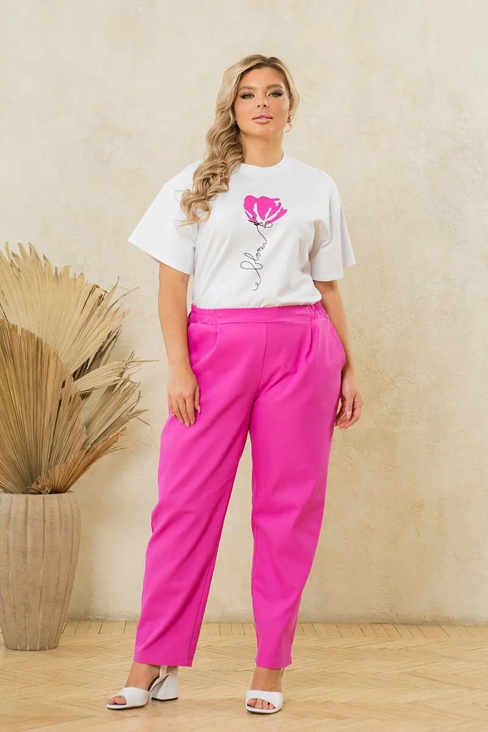 Модные современные брюки с полной высотой талии и дополнительным объемом в бедрах, заложенным в складки. Выполнены из джинсовой ткани с добавлением эластана. Расцветка фуксия. Комфортную посадку на та... Показать описаниелии обеспечивает притачной пояс с эластичной резинкой. С карманами. Идеальный вариант для офиса и повседневной носки. Рекомендуемая стирка при t не более 30. ДИ в 48-64р 102 см. Рост модели 170 см, размер 54.