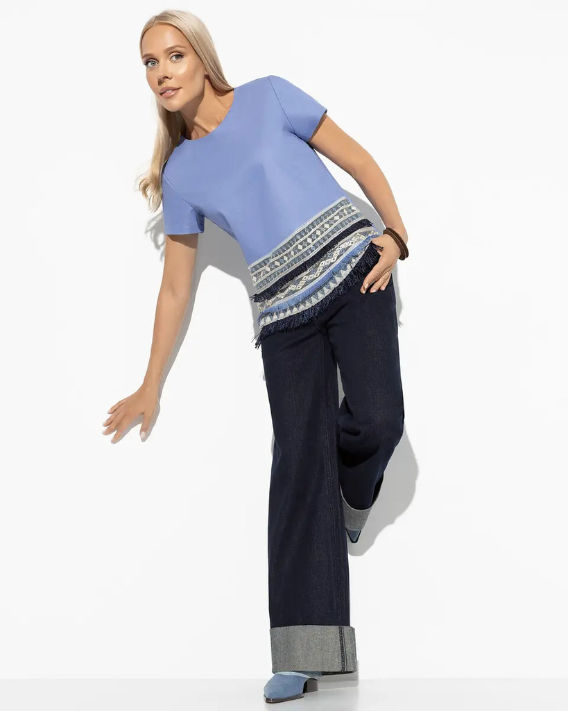 Снова здравствуйте! Деним возвращается на модные вершины. CHARUTTI берет еще выше и дополняет трендовый материал акцентной вышивкой, что делает блузу самым желанным объектом. Блуза прямого силуэта. Вы... Показать описаниешивка из паеток и бахромы по передней части изделия. Скрытая молния по спинке.