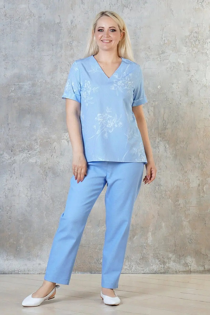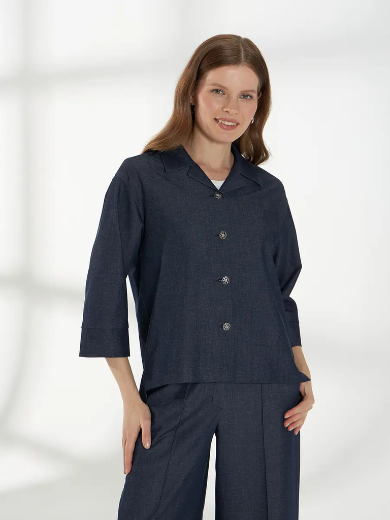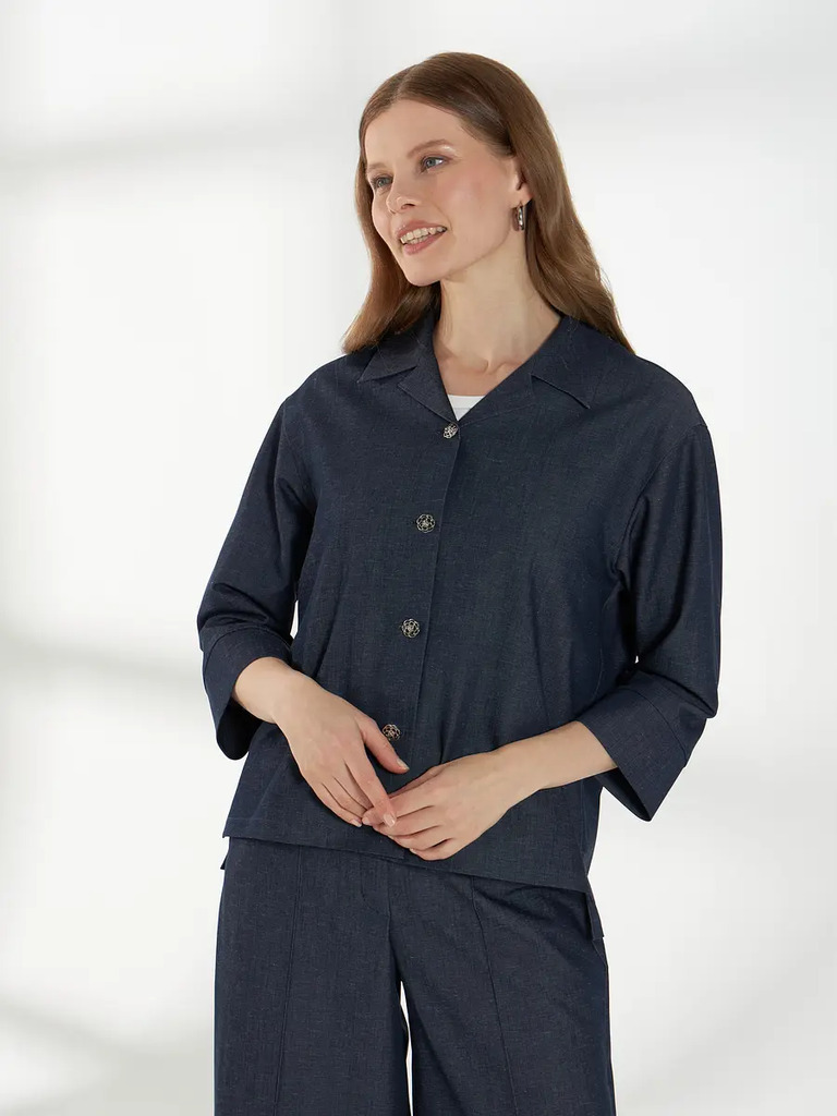 Стильная блуза-жакет прямого кроя из легкой ткани с эффектом денима-универсальная модель для повседневных и деловых образов. Рукав 3/4 придает силуэту легкость и делает акцент на линии запястья, а акк... Показать описаниеуратные разрезы по бокам добавляют комфорта и свободы движения. Изящные пуговицы служат элегантным акцентом и подчеркивают лаконичный дизайн модели. Материал позволяет коже дышать, отлично держит форму и сохраняет безупречный внешний вид в течение всего дня. Идеально сочетается с брюками Б-2054 ДКС(В6) и джемпером С-34 РОУ(В6).