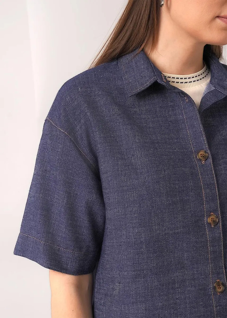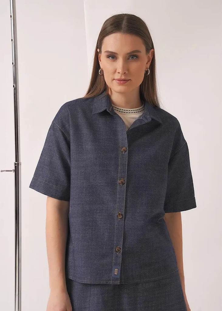 Блузка из текстильного полотна джинс, прямого силуэта. Отложной воротник со стойкой, по борту цельновыкроенная планка с пуговицами, внизу нашивка. Короткий рукав. На спинке кокетка.