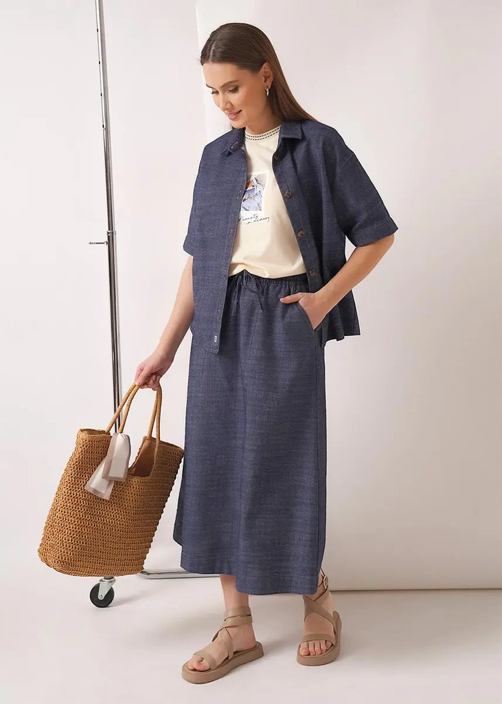 Эффектная удлиненная блузка светло-синего цвета с поясом выполнена из джинсового лиоцелла плотностью 7,8 OZ.. Универсальная модель идеально подходит для повседневной носки, пояс подчеркивает талию и с... Показать описаниекрывает небольшие недостатки фигуры, сохраняя при этом стильный вид. Отложной воротник создает аккуратный внешний образ, придавая классической рубашке элегантность. На груди расположены карманы, которые добавляют практичности. Ткань сочетает прочность и мягкость лиоцелла с вискозой, что делает ее невероятно комфортной, дышащей, устойчивой к сминанию и идеально подходящей для чувствительной кожи. Благодаря нежным тактильным ощущениям, будто шелк, от которого ощущается приятная прохлада, рубашка отлично подходит для создания легких летних образов или стильных ансамблей на каждый день засчет своей универсальности. Широкий рукав средней длины гарантирует свободу движений и удобство на весь день. Джинсовую блузку можно сочетать в стиле кэжуал, а также создавать монохромные образы или добавлять яркие акценты с помощью аксессуаров. Эта джинсовая рубашка на пуговицах станет базовым элементом гардероба для тех, кто ценит сочетание классики, моды и удобства. Рекомендуем сочетать с артикулами: D54.257, D56.127, D54.239