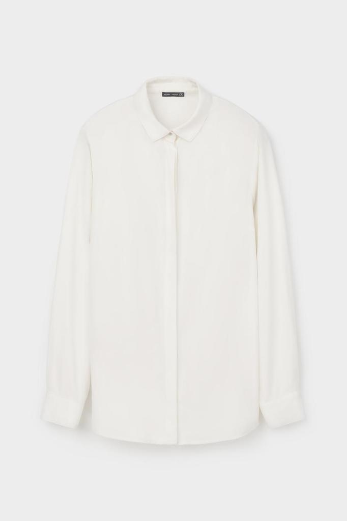 Блузка классического прямого кроя с длинными рукавами на манжетах и застежкой на планку с пуговицами.