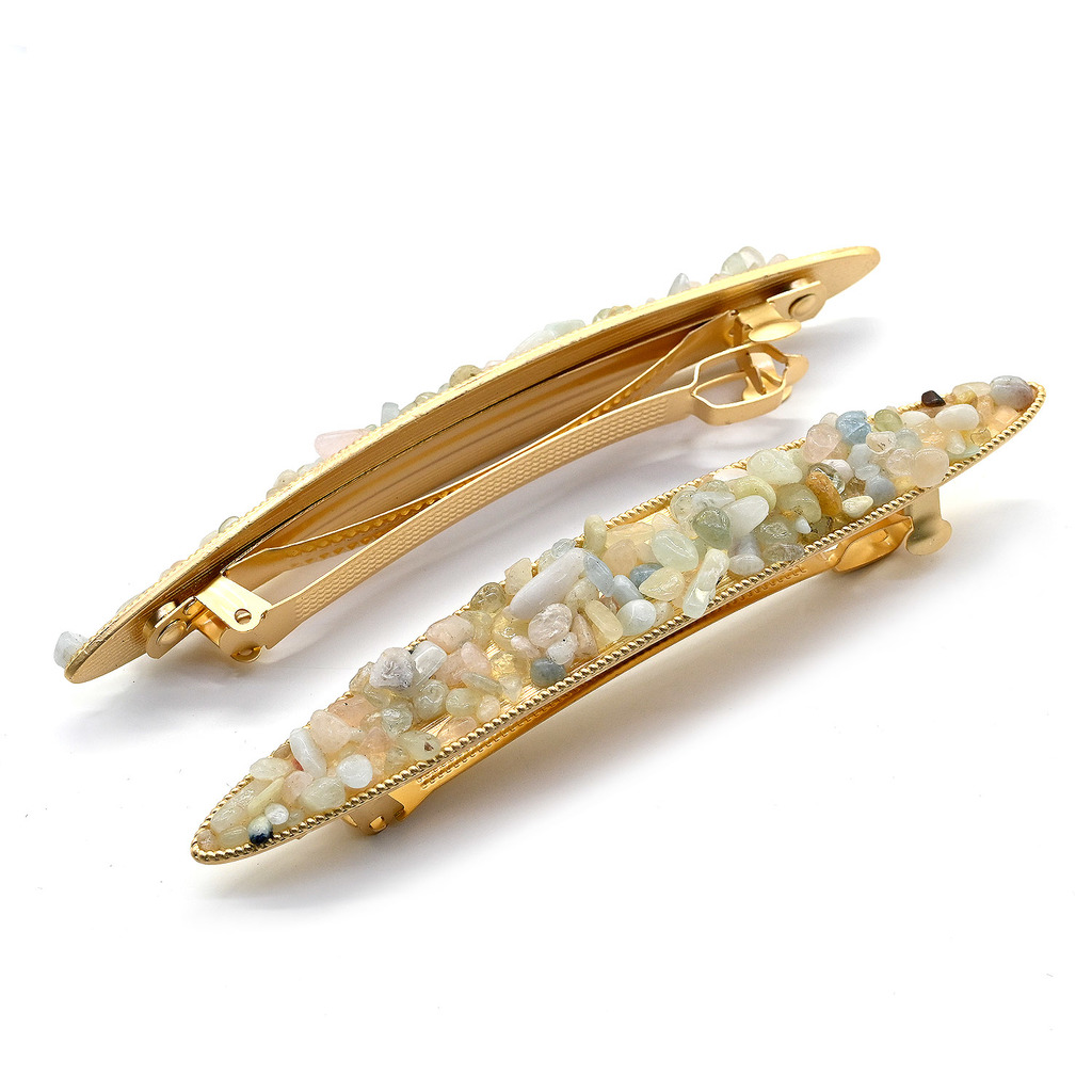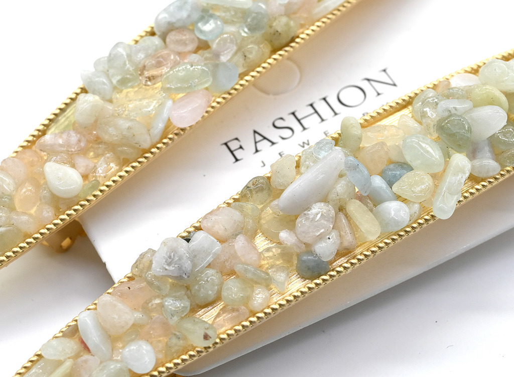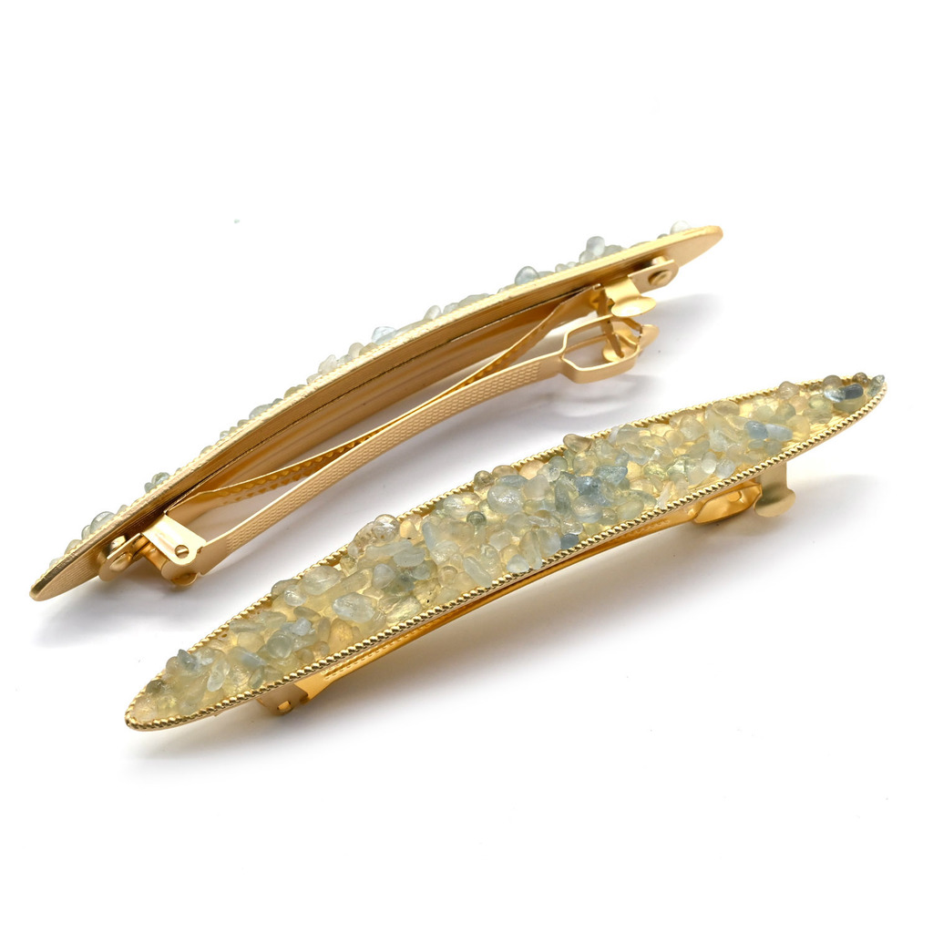Материал: Берилл Натуральность: Натуральный камень Месторождение: Бразилия •Заколка зажим с крошкой из натурального берилла и майоркой. •Металлический зажим для волос – незаменимый аксессуар для созда... Показать описаниения стильного образа! •Зажим выполнен из прочного материала, обеспечивающего надёжную фиксацию даже объёмной причёски, позволяя создавать различные вариации укладок каждый день. •Подходит как для повседневного применения, так и для вечернего выхода. Прочный механизм гарантирует длительный срок эксплуатации без потери функциональности. •Габариты заколки: длина 6,5см, ширина 2,5см. •Габарит заколки ± 1мм. •Цена за 1 шт.