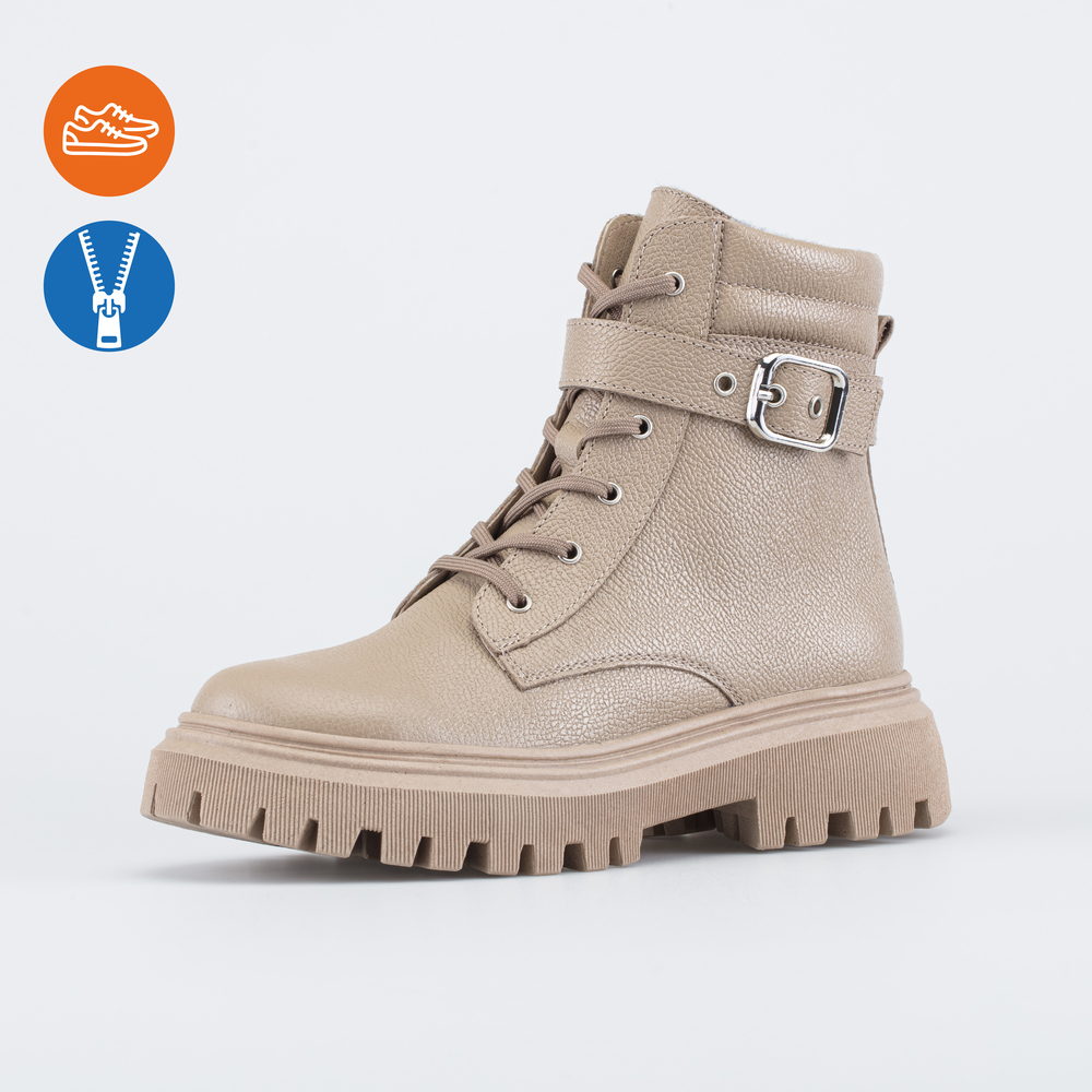 Описание Описание модели Утепленные кожаные ботинки бежевого цвета подходят для девочки-подростка. Верх выполнен из дышащей натуральной кожи. Подкладка из шерстяной байки и войлочная стелька согревают... Показать описание и отводят от стоп испарения. Шнурки позволяют отрегулировать обувь по подъему, а молнии - быстро обуваться и разуваться. Массивная тракторная подошва из ТЭП (термоэластопласта) обеспечивает дополнительную теплоизоляцию и устойчивость на скользких поверхностях. Модель украшена ремешком с пряжкой. Обувь анатомически правильная: создана с учетом особенностей подростковой стопы. Сделано в России, Егорьевск.