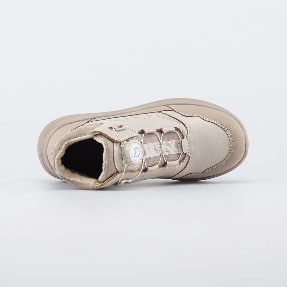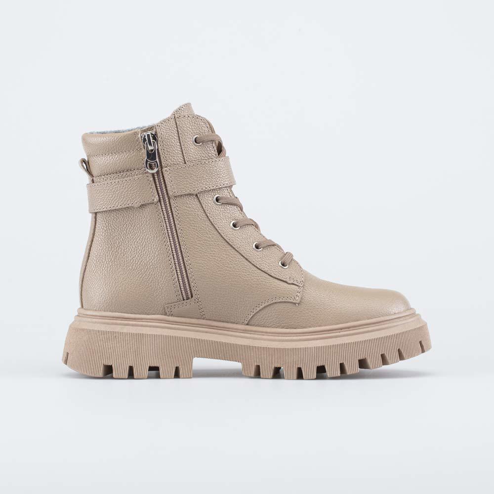 Демисезонные ботинки для девочки на байковой подкладке бежевого цвета Верх выполнен из натуральной кожи - износостойкого, гипоаллергенного и дышащего материала. Подкладка и стелька из байки, которые н... Показать описаниеа 80% состоят из натуральной шерсти, хорошо сохраняют тепло. Шнурки позволяют отрегулировать обувь по подъему, а молния - быстро обуваться и разуваться. Подошва из ТЭП (термоэластопласта) - гибкая и амортизирующая. Модель анатомически правильная: имеет небольшой каблучок/танкетку, в меру жёсткий задник и круглый носок. А стелька из натуральной шерсти имеет свойство приформовываться к своду стопы, таким образом создавая индивидуальную анатомическую форму внутреннего пространства в обуви, подходящую только вашему ребенку. Это положительно влияет на правильное развитие стоп и всего опорно-двигательного аппарата. Сделано в России.
