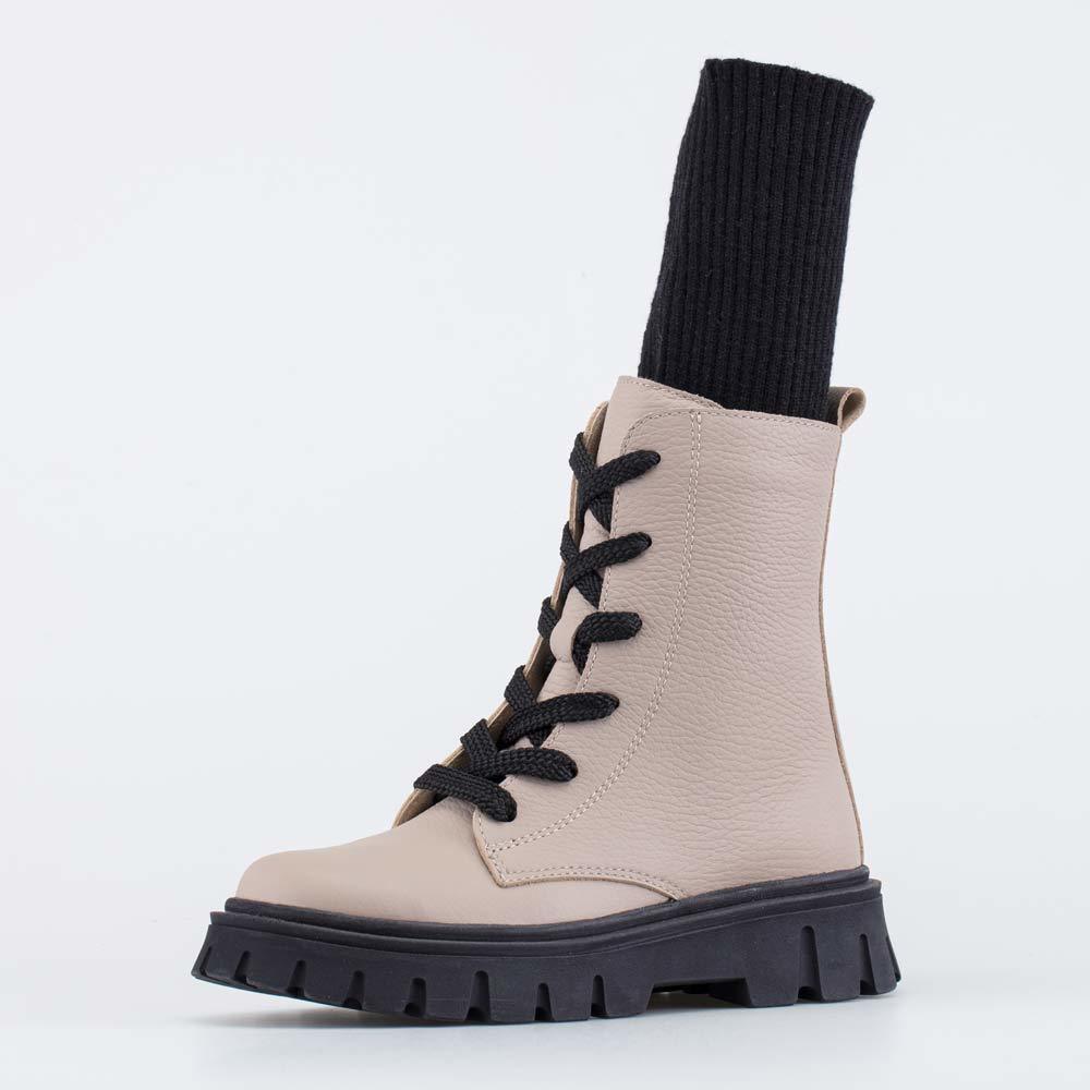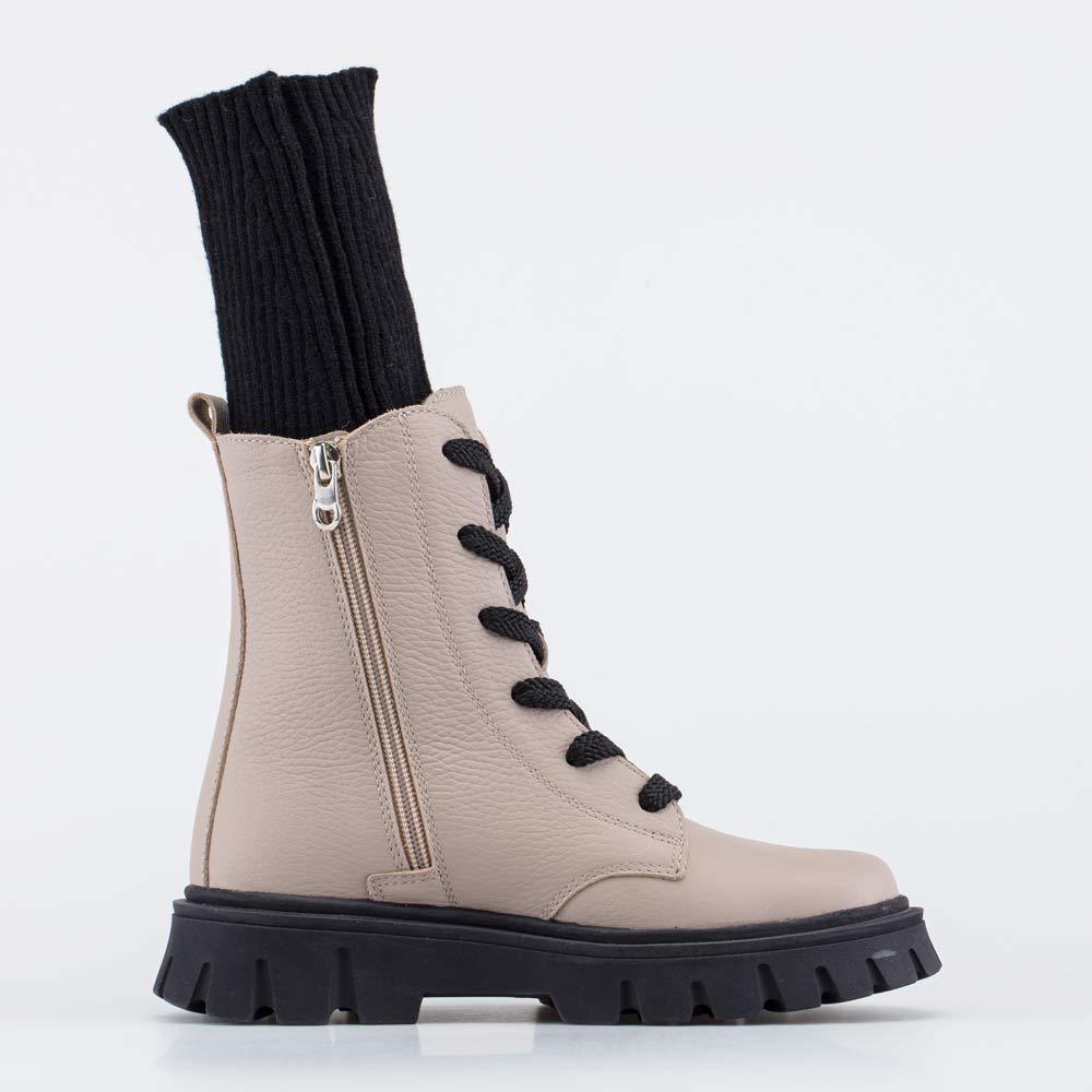 Описание Описание модели Высокие ботинки идеально подойдут для девочки подросткового возраста на весеннее или осеннее межсезонье. Верх выполнен из натуральной гладкой кожи светлого бежевого цвета. Под... Показать описаниекладка из байки (больше 80% натуральная овечья шерсть) и войлочная стелька хорошо сохраняют тепло. Внутри защита пятки от истирания - кожаная накладка поверх утеплителя. Войлочная стелька снабжена шелковой петелькой, чтобы было удобно вынимать для проветривания. Ботинки на шнурках позволяют оптимально подогнать обувь по ноге, а молния помогает быстро обуваться. Массивная тракторная подошва из ТЭП (термоэластопласта) обеспечивает дополнительную теплоизоляцию и устойчивость на скользких поверхностях. Модель украшена несъемным ремешком с пряжкой. Модель разработана с учетом особенностей подростковой стопы и имеет элементы, которые обеспечивают правильную поддержку. Высота подошвы ~ 4 см. Сделано в России, Егорьевск.