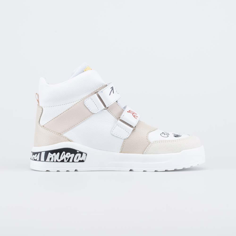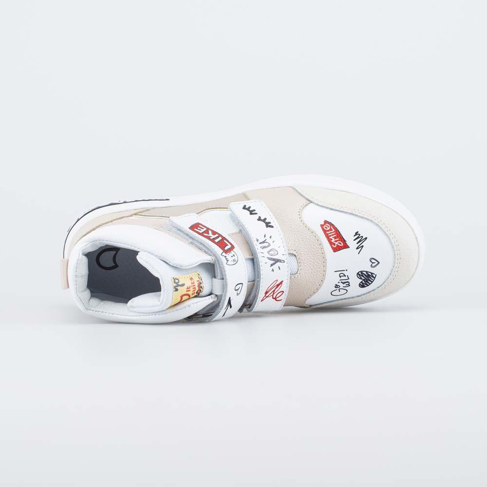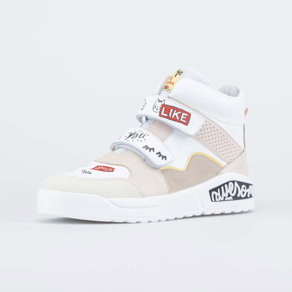 Описание Описание модели Светлые кожаные ботинки для девочки украшены веселыми принтами, что придает им стильный современный вид. Тему современности подчеркивает надпись на подошве. Верх, подкладка и ... Показать описаниеформованная стелька изготовлены из натуральной кожи - дышащего материала, который обеспечивает оптимальный микроклимат внутри обуви. Застежки в виде двух липучек-велькро позволяют быстро обуваться и разуваться, а также отрегулировать обувь по подъему. Носочная часть защищена кожаной накладкой с полиуретановым покрытием, которая продлевает срок службы обуви. Подошва из ПУ (полиуретана) - гибкая и амортизирующая. Обувь предназначена для детей школьного возраста, поэтому особое внимание уделено правильной конструкции: модель имеет пятку необходимой жесткости, мягкий подсводник, приподнятость пяточной части, круглый носок. Сделано в России, Егорьевск.