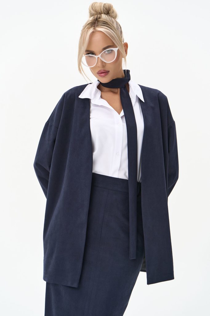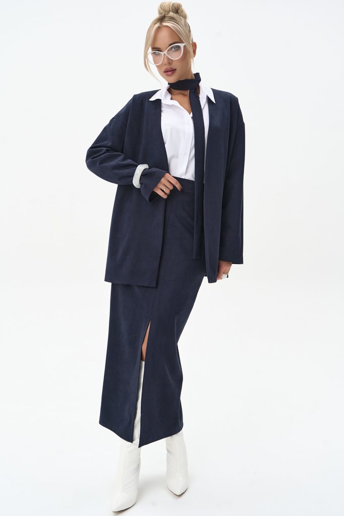 Состав: Полиэстер 80% / Вискоза 15% / Эластан 5% Описание Костюм из мягкой замшевой ткани в двух оттенках — глубокий чёрный и природный оливковый. Лаконичный жакет в паре с прямой юбкой формируют чист... Показать описаниеый силуэт и создают образ современной элегантности. Структурированная форма сочетается с мягкой тактильностью ткани, делая комплект универсальным выбором для офиса, встреч и вечерних выходов. Минималистичные линии, продуманная посадка, сдержанный акцент на текстуру — костюм, который работает за вас. Длины: ( 44-46р- 68 см, 48-50р-69 см,52-54р-70 см, рукав 60см). Материал Высококачественная искусственная замша: мягкая, матовая, с бархатистой фактурой. Плотность средней степени — держит форму, не утяжеляя комплект. Крой:приталенный, с мягко оформленной линией плеч. Воротник: классический лацкан средней ширины. Рукав: полный, аккуратная линия без объёма. Рост модели: 172 см Параметры модели: 88-63-96m, размер 44 Рост модели: 172 см Параметры модели: 88-63-96, размер 44