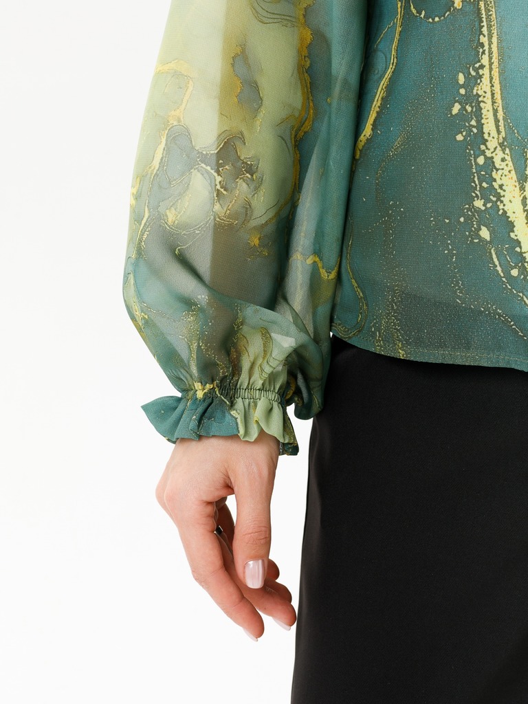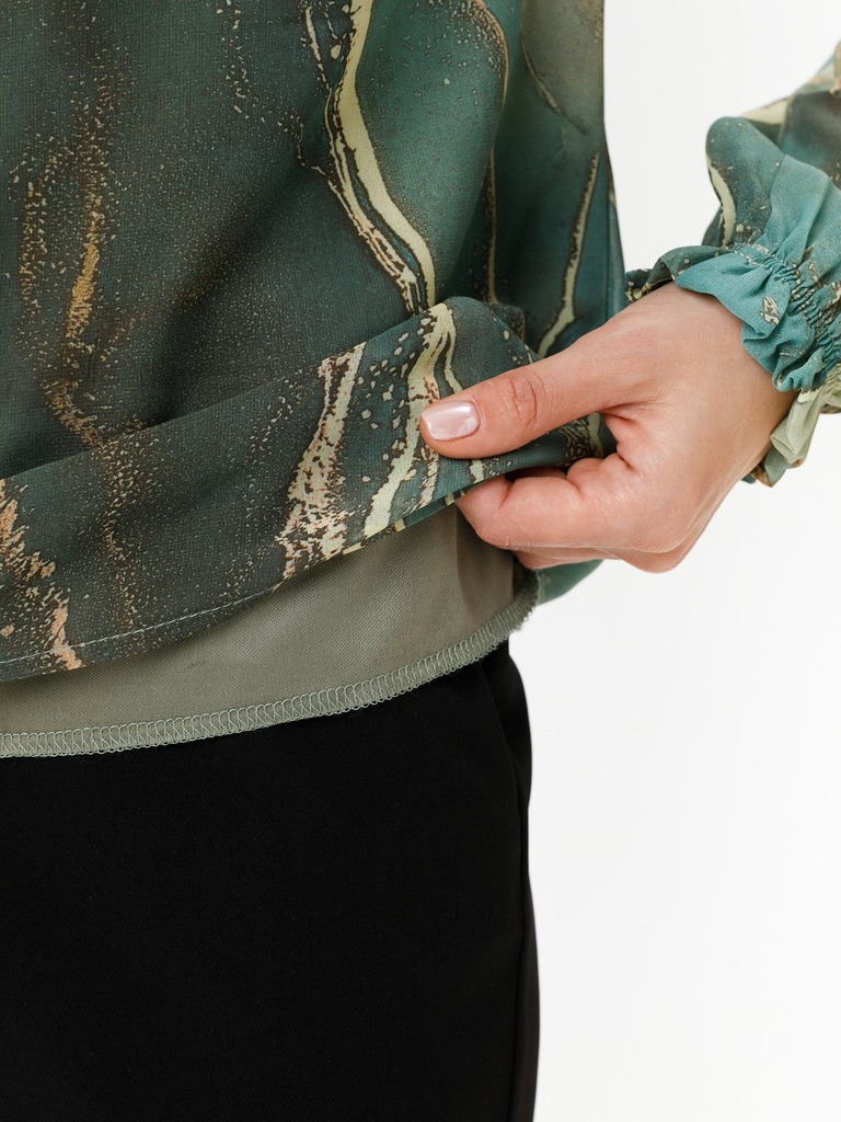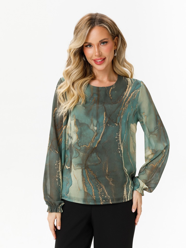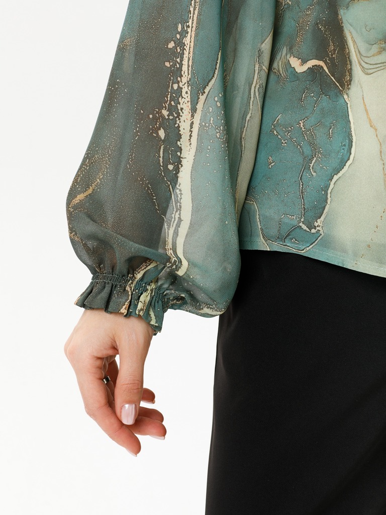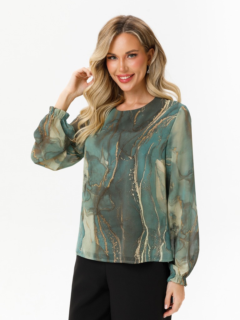 Модель выполнена из шифона и трикотажной подкладочной ткани. Состав: 100% полиэстер. Шифоновая блузка с авторским принтом – настоящая находка для всех модниц! Утонченный благородный дизайн делает ее и... Показать описаниедеальным выбором для любого особого случая. Легкая, с изящным воротником стойкой, широкие объемные пышные рукава- все это превращает повседневный образ в необычный и оригинальный. В этой красивой блузе из шифона вы всегда будете выглядеть потрясающе! Прямая свободная блуза с идеальной посадкой на любую фигуру, ее легко сочетать с брюками, джинсами или юбкой, надевать под пиджак или жакет. Воротник стойка сзади переходит в завязки с длинными концами, из которых получается великолепный бант. Можно сделать свободный узел и оставить ленты, либо перекинуть их вперед, создав тем самым новый образ. Рукав длинный, на резинке с красивой рюшей по низу. Длина изделия: 44р-67 см, 46р-67 см, 48р-69 см, 50р-69 см, 52р-69 см, 54р-69 см Длина рукава во всех размерах до резинки 56 см, длина рюши на рукаве во всех размерах 6,5 см Замеры изделия: 44 размер: по груди 106 см 46 размер; по груди 114 см 48 размер: по груди 118 см 50 размер: по груди 122 см 52 размер: по груди 126 см 54 размер: по груди 132 см