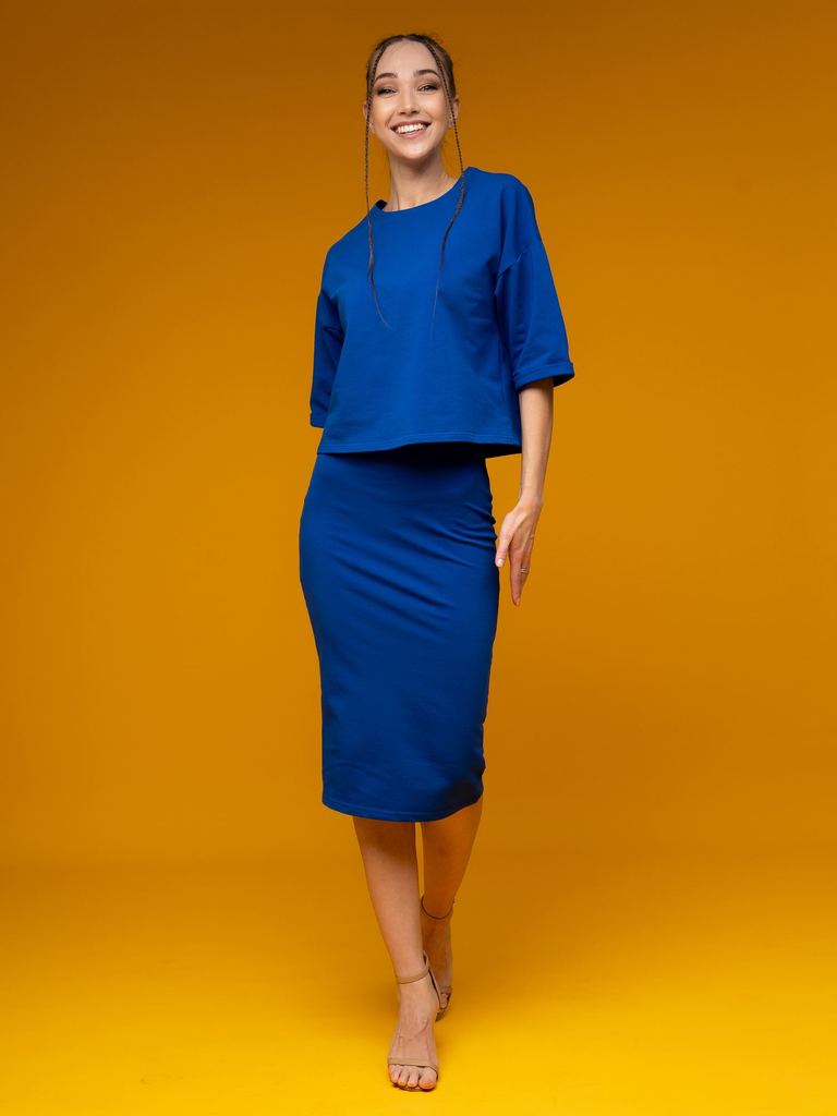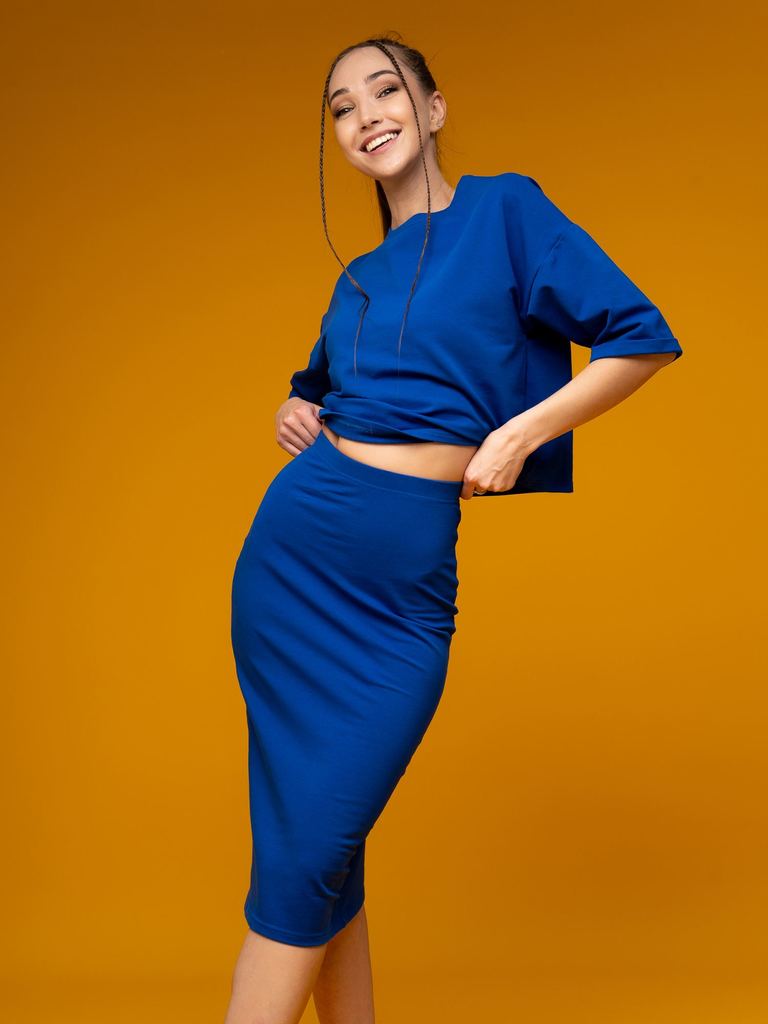 Прежняя цена - 1400 руб. Описание и параметры Костюм-двойка ,состоит из футболки и юбки. Укороченная футболка свободного силуэта со спущенной линией плеча. Широкие рукава до линии локтя. Узкая юбка-ка... Показать описаниерандаш, с цельнокроенным поясом резинке. Изделие выполнено из трикотажа премиального качества - ПЕНЬЕ, с содержанием хлопка более 92% Артикул FP30022FUvas Цвет Васильковый Материал Футер Состав 92%хлопок,8%полиэст. Размеры * 2XS Длина верха: 55 Длина низа: 65 Длина рукава: 45 Обхват груди: 80 Обхват по бёдрам: 88 Ширина изделия под проймой: 50