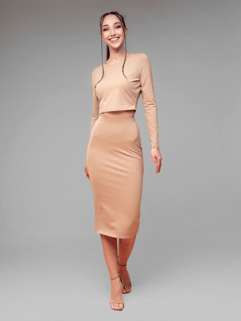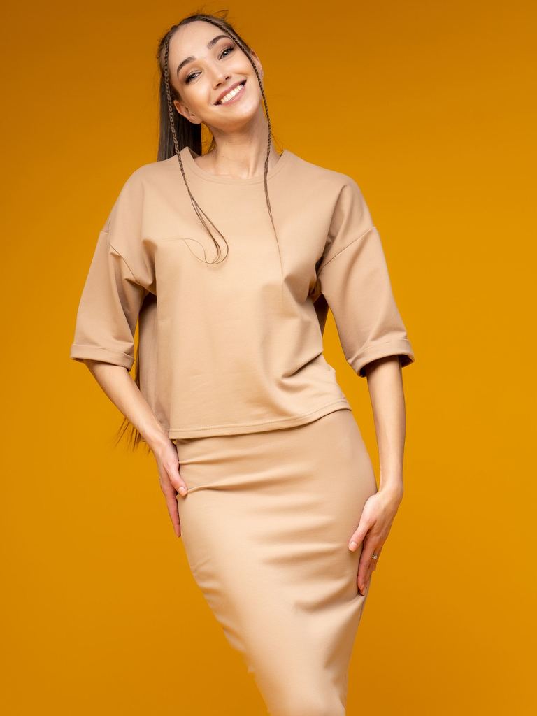 Прежняя цена - 1400 руб. Описание и параметры Костюм-двойка ,состоит из футболки и юбки. Укороченная футболка свободного силуэта со спущенной линией плеча. Широкие рукава до линии локтя. Узкая юбка-ка... Показать описаниерандаш, с цельнокроенным поясом резинке. Изделие выполнено из трикотажа премиального качества - ПЕНЬЕ, с содержанием хлопка более 92% Артикул FP30022FUbeg Цвет Бежевый Материал Футер Состав 92%хлопок,8%полиэст. Размеры * 2XS Длина верха: 55 Длина низа: 65 Длина рукава: 45 Обхват груди: 80 Обхват по бёдрам: 88 Ширина изделия под проймой: 50