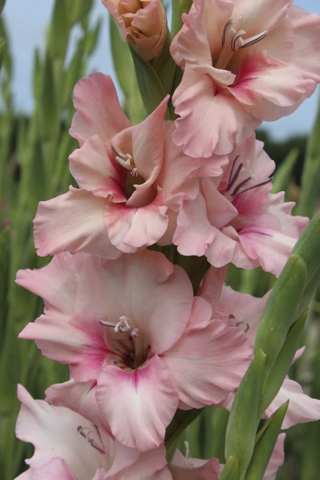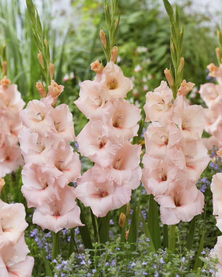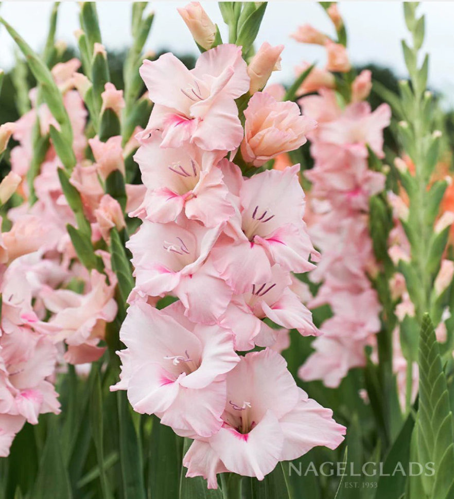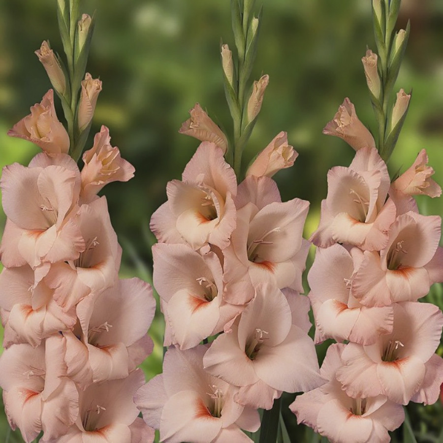 Оригинальная нежная расцветка! Основной цвет жемчужно-розовый, в нижней части лепестков мазки насыщенно-розового с капелькой абрикосового. * Высота: 100-110 см * Длина колоса: 50 см * Цветение: август... Показать описание-сентябрь Агротехника: * В начале апреля очищенные от кроющих чешуй клубнелуковицы размещают в коробках (или других подходящих емкостях) и выставляют на рассеянный свет. За время до посадки почти у всех клубнелуковиц появятся ростки (до 3-5 см). * Гладиолус – светолюбивое растение, поэтому для посадки необходимо выбирать открытый участок, хорошо освещаемый солнцем. Участок, где будут выращиваться гладиолусы, тщательно обрабатывают: перекапывают (на глубину 30-40 см), очищают от сорняков, по необходимости вносят органические и минеральные удобрения. Лучшие предшественники для гладиолусов : томаты, чеснок, лук, бобовые, земляника, цинния, бархатцы, георгины. * Глубина и густота посадки гладиолусов зависит от размера клубнелуковиц. В среднем, клубнелуковицы сажают на глубину 10-15 см, с расстоянием между ними 7-20 см. * Посадку проводят в бороздки, хорошо пролитые водой. Перед посадкой на дно бороздки насыпают речной песок (1-2 см) или укладывают небольшой слой мха. Этот прием будет препятствовать распространению грибных болезней и позволит сохранить влагу при сухой погоде. После посадки землю мульчируют. * Уход заключается в своевременных прополках, рыхлении, поливах и подкормках. * Клубнелуковицы гладиолусов погибают при минусовых температурах, поэтому на зиму их необходимо выкапывать и хранить до посадки следующей весной. Клубнелуковицы выкапывают лопатой или вилами с широкими, плоскими зубьями, затем осторожно очищают от почвы. Стебли гладиолусов срезают, оставляя у клубнелуковиц небольшой черешок (0,5-1,0 см). * Клубнелуковицы просушивают в хорошо проветриваемом месте при температуре 20-30 градусов, в течение 1-1,5 месяца. Зимой клубнелуковицы гладиолусов хранятся в сухом, прохладном месте, при температуре 0-8 градусов.