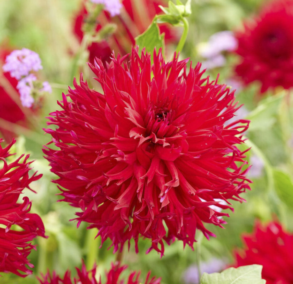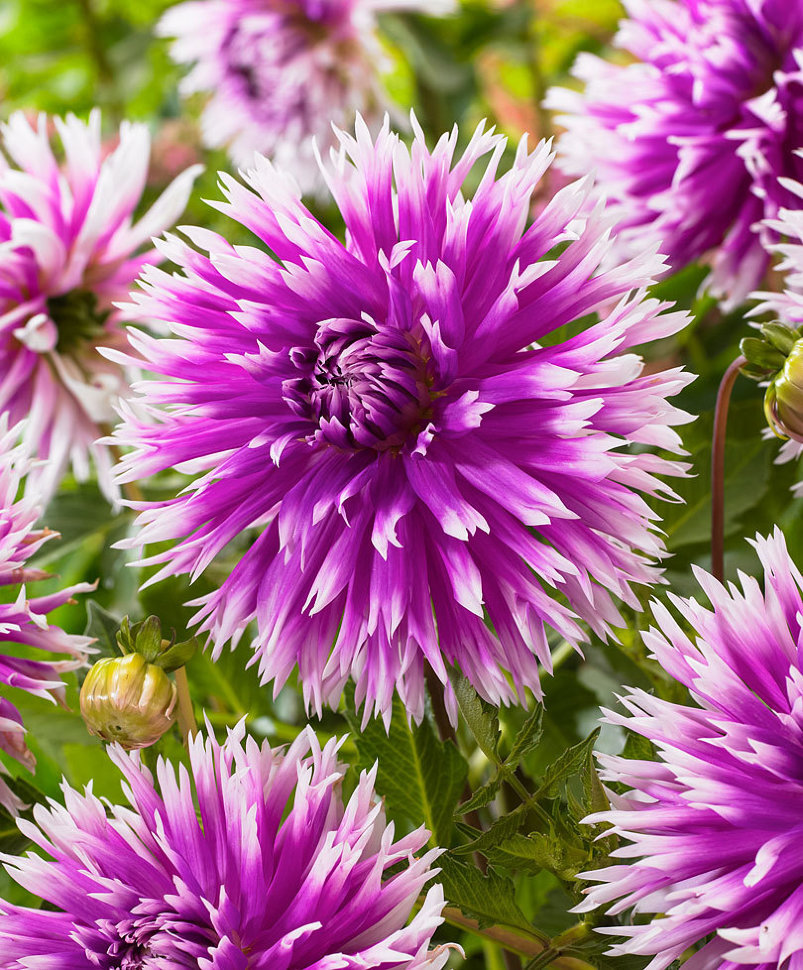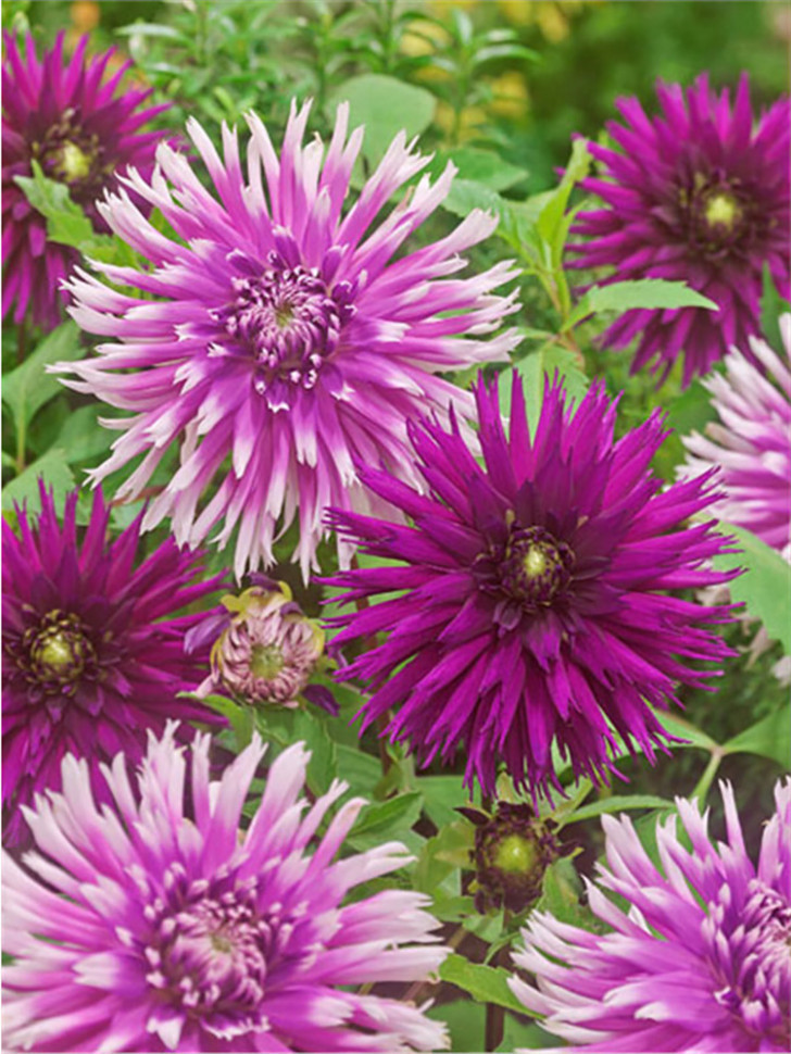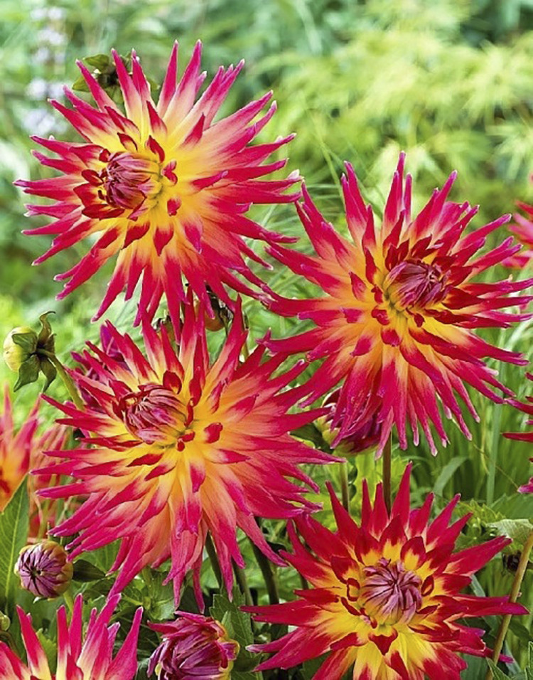 Яркая смесь двух сортов кактусовидных (да еще и бахромчатых!) георгин - Table Dancer и Ambition. Высота: 90-110 см. Диаметр цветка: 10-15 см. Агротехника: Местоположение: солнечные, защищенные от холо... Показать описаниедных и сильных ветров места с хорошей циркуляцией воздуха. Нельзя высаживать их на низких и заболоченных участках. Расстояние при посадке зависит от высоты и формы куста того или иного сорта. Участок, выбранный для георгин, должен освещаться днем по крайней мере шесть часов. Почва: богатый перегноем жирный садовый суглинок, рН 6,5-6,7. Хороша для георгинов и удобренная песчаная почва. Участок, предназначенный под георгины, с осени вскапывают, а весной перекапывают. Посадочный материал обычно высаживают в грунт, когда минует угроза возвратных заморозков. В ямы размером 30 х 30 х 30 см, насыпают заранее подготовленный субстрат и комплексное минеральное удобрение. В зависимости от высоты, расстояние между растениями в ряду — 60–90 см. При правильной посадке корневая шейка должна быть на 2-3 см ниже уровня почвы. После посадки растения обильно поливают. Уход за георгинами несложный — обильный полив, мульчирование опилками слоем 6–9 см, подкормки и удаление лишних побегов. Для получения более крупных соцветий обычно удаляют пазушные побеги и выщипывают боковые бутоны. В октябре клубни выкапывают, предварительно обрезав стебли выше корневой шейки на 10–15 см. Клубни очищают от земли и подсушивают. Стебли укорачивают до 3–5 см. Посадочный материал закладывают в ящик с торфом и хранят при температуре от +2 до +6°С.