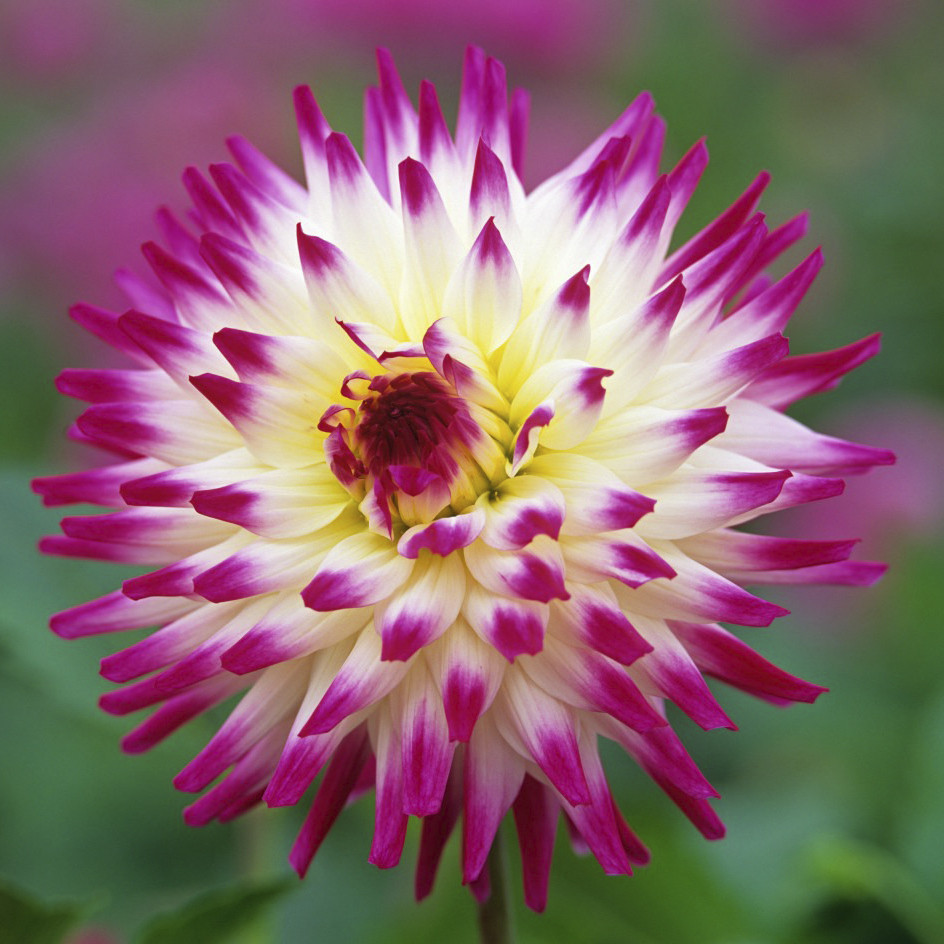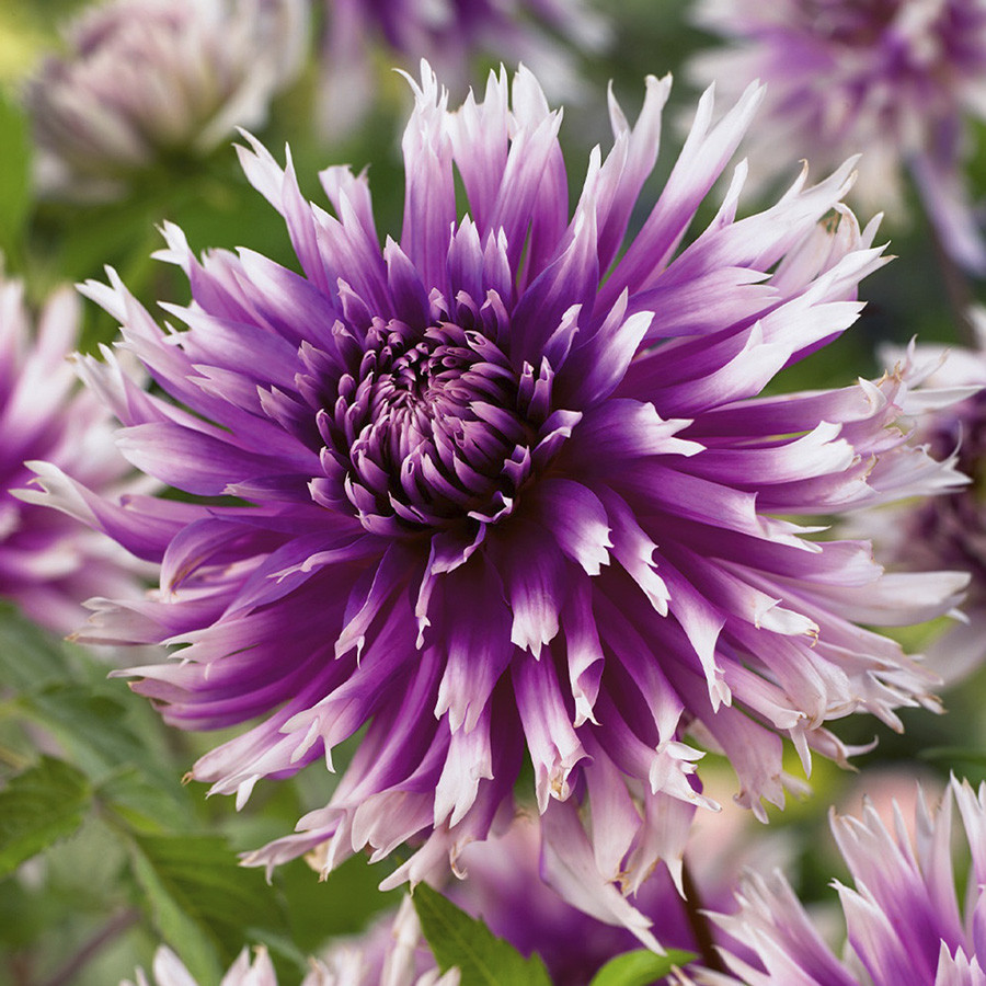 Необычный и очень красивый сорт. Лепестки игольчатой формы, молочно-белого цвета, по краям приобретают контрастную сиреневую расцветку. В серединке цветка белый цвет меняется на тёплый пастельно-жёлты... Показать описанией. Сорт выведен в Великобритании в 1978 году, отлично подходит для всех видов садовых композиций, рекомендуется для составления букетов. Агротехника: Местоположение: солнечные, защищенные от холодных и сильных ветров места с хорошей циркуляцией воздуха. Нельзя высаживать их на низких и заболоченных участках. Расстояние при посадке зависит от высоты и формы куста того или иного сорта. Участок, выбранный для георгин, должен освещаться днем по крайней мере шесть часов. Почва: богатый перегноем жирный садовый суглинок, рН 6,5-6,7. Хороша для георгинов и удобренная песчаная почва. Участок, предназначенный под георгины, с осени вскапывают, а весной перекапывают. Посадочный материал обычно высаживают в грунт, когда минует угроза возвратных заморозков. В ямы размером 30 х 30 х 30 см, насыпают заранее подготовленный субстрат и комплексное минеральное удобрение. В зависимости от высоты, расстояние между растениями в ряду — 60–90 см. При правильной посадке корневая шейка должна быть на 2-3 см ниже уровня почвы. После посадки растения обильно поливают. Уход за георгинами несложный — обильный полив, мульчирование опилками слоем 6–9 см, подкормки и удаление лишних побегов. Для получения более крупных соцветий обычно удаляют пазушные побеги и выщипывают боковые бутоны. В октябре клубни выкапывают, предварительно обрезав стебли выше корневой шейки на 10–15 см. Клубни очищают от земли и подсушивают. Стебли укорачивают до 3–5 см. Посадочный материал закладывают в ящик с торфом и хранят при температуре от +2 до +6°С.