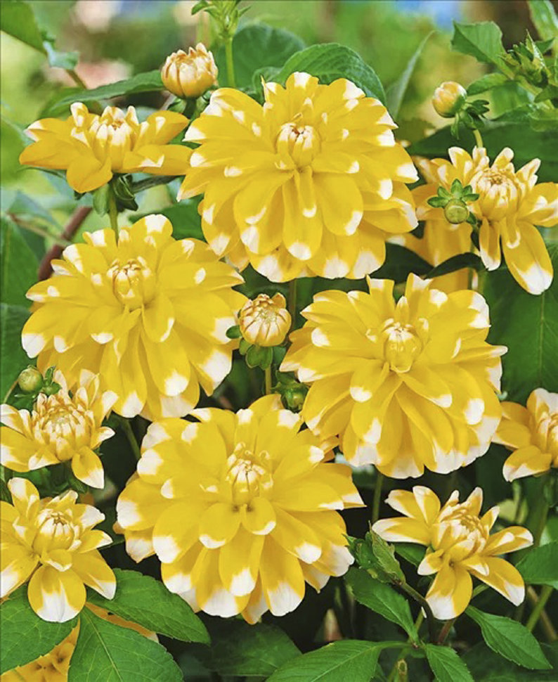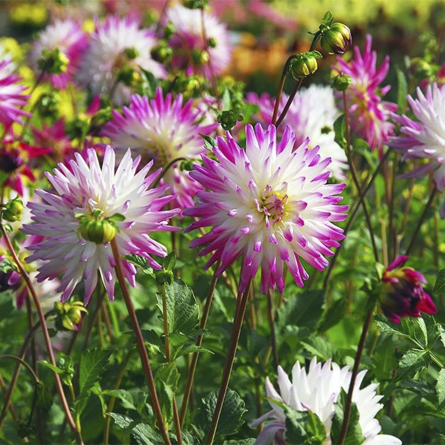 Эффектная смесь двух сортов георгин Dutch Carnaval и Painted Madam. Высота: 90-100 см. Диаметр цветка: 10-15 см. Агротехника: Местоположение: солнечные, защищенные от холодных и сильных ветров места с... Показать описание хорошей циркуляцией воздуха. Нельзя высаживать их на низких и заболоченных участках. Расстояние при посадке зависит от высоты и формы куста того или иного сорта. Участок, выбранный для георгин, должен освещаться днем по крайней мере шесть часов. Почва: богатый перегноем жирный садовый суглинок, рН 6,5-6,7. Хороша для георгинов и удобренная песчаная почва. Участок, предназначенный под георгины, с осени вскапывают, а весной перекапывают. Посадочный материал обычно высаживают в грунт, когда минует угроза возвратных заморозков. В ямы размером 30 х 30 х 30 см, насыпают заранее подготовленный субстрат и комплексное минеральное удобрение. В зависимости от высоты, расстояние между растениями в ряду — 60–90 см. При правильной посадке корневая шейка должна быть на 2-3 см ниже уровня почвы. После посадки растения обильно поливают. Уход за георгинами несложный — обильный полив, мульчирование опилками слоем 6–9 см, подкормки и удаление лишних побегов. Для получения более крупных соцветий обычно удаляют пазушные побеги и выщипывают боковые бутоны. В октябре клубни выкапывают, предварительно обрезав стебли выше корневой шейки на 10–15 см. Клубни очищают от земли и подсушивают. Стебли укорачивают до 3–5 см. Посадочный материал закладывают в ящик с торфом и хранят при температуре от +2 до +6°С.