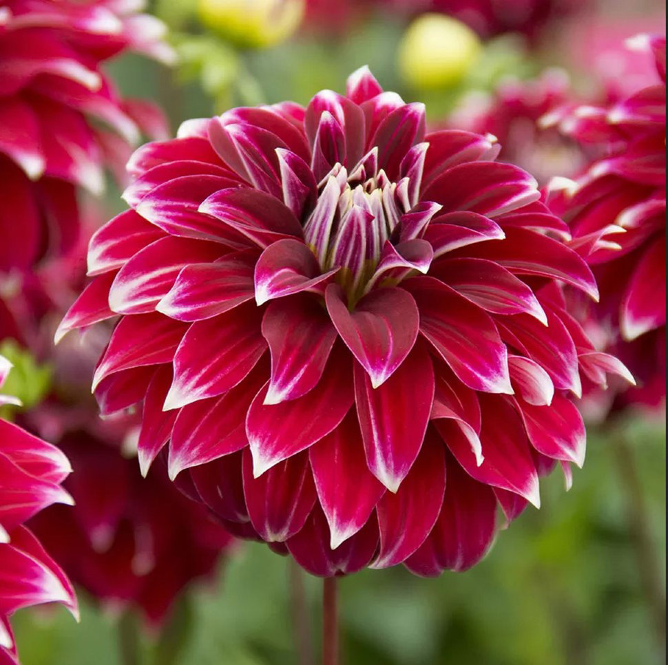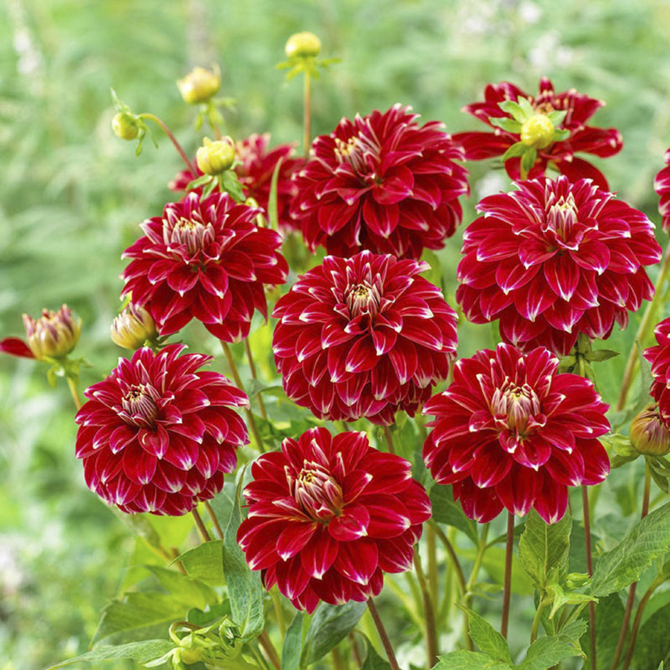 Будто кто-то прикоснулся пальцем ко всем красным лепесткам георгины Мьюзетт, оставив снежно-белый след... Благодаря такому крупные шаровидные цветы смотрятся очень оригинально! Сорт был выведен в Голл... Показать описаниеандии в 1954 году и пользуется неизменной любовью всех садоводов. Агротехника: Местоположение: солнечные, защищенные от холодных и сильных ветров места с хорошей циркуляцией воздуха. Нельзя высаживать их на низких и заболоченных участках. Расстояние при посадке зависит от высоты и формы куста того или иного сорта. Участок, выбранный для георгин, должен освещаться днем по крайней мере шесть часов. Почва: богатый перегноем жирный садовый суглинок, рН 6,5-6,7. Хороша для георгинов и удобренная песчаная почва. Участок, предназначенный под георгины, с осени вскапывают, а весной перекапывают. Посадочный материал обычно высаживают в грунт, когда минует угроза возвратных заморозков. В ямы размером 30 х 30 х 30 см, насыпают заранее подготовленный субстрат и комплексное минеральное удобрение. В зависимости от высоты, расстояние между растениями в ряду — 60–90 см. При правильной посадке корневая шейка должна быть на 2-3 см ниже уровня почвы. После посадки растения обильно поливают. Уход за георгинами несложный — обильный полив, мульчирование опилками слоем 6–9 см, подкормки и удаление лишних побегов. Для получения более крупных соцветий обычно удаляют пазушные побеги и выщипывают боковые бутоны. В октябре клубни выкапывают, предварительно обрезав стебли выше корневой шейки на 10–15 см. Клубни очищают от земли и подсушивают. Стебли укорачивают до 3–5 см. Посадочный материал закладывают в ящик с торфом и хранят при температуре от +2 до +6°С.