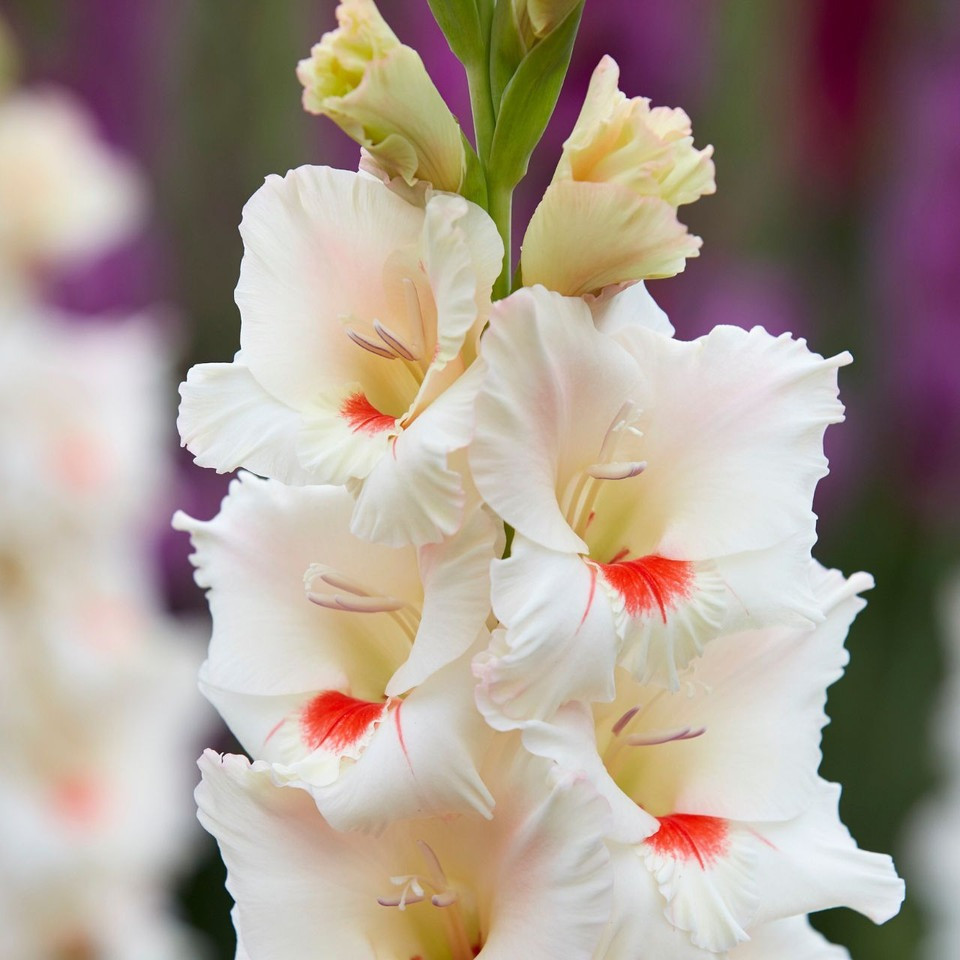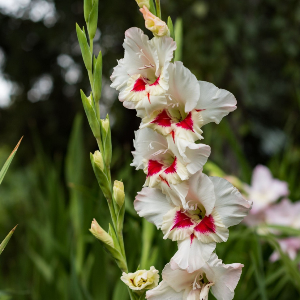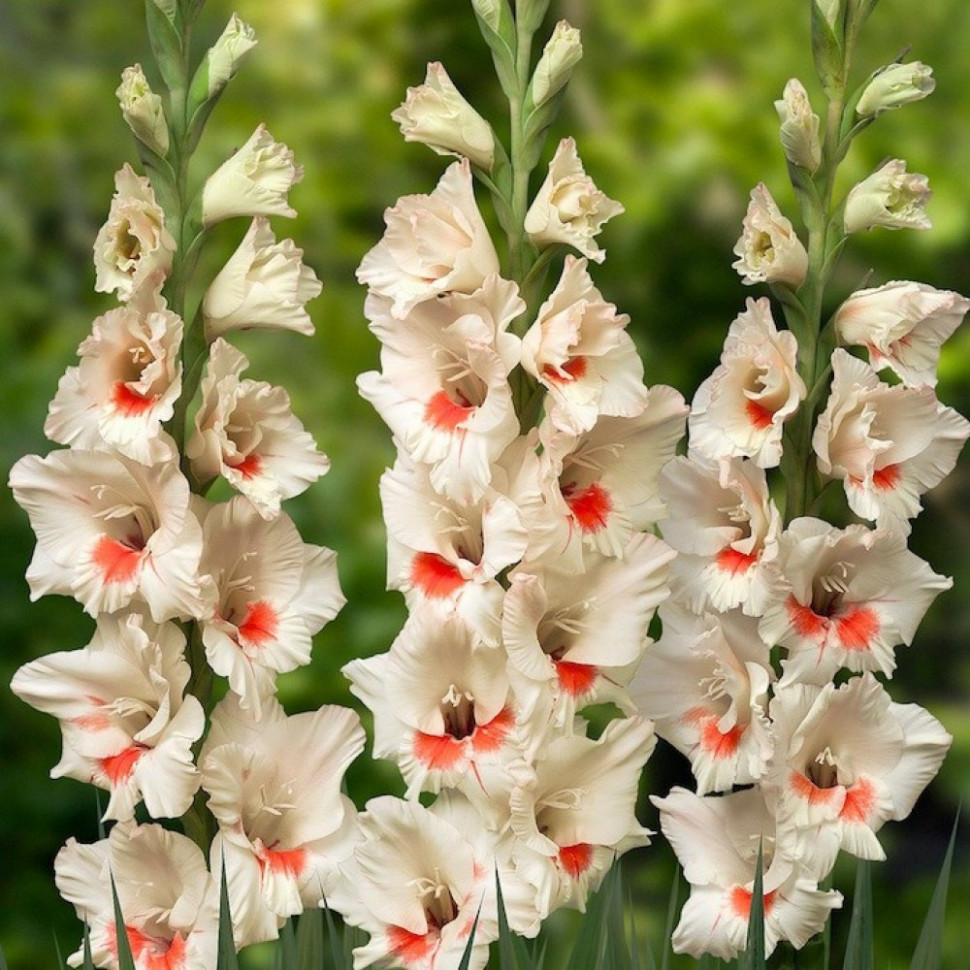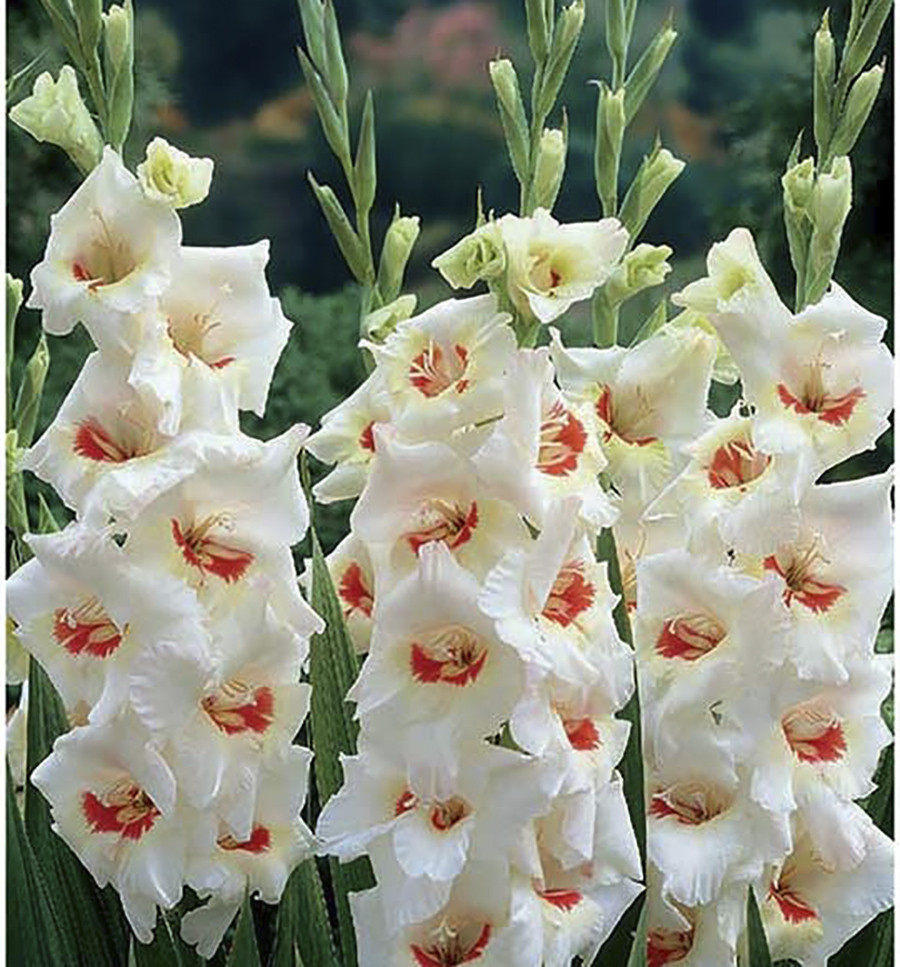 У этого сорта эффектные соцветия цвета слоновой кости, крупные цветы с яркими красными серединками; идеально подходит для заполнения задней части летнего бордюра яркими красками и светом. Высота: 120 ... Показать описаниесм. Длина колоса: 60 см. Цветение: август-сентябрь. Агротехника: В начале апреля очищенные от кроющих чешуй клубнелуковицы размещают в коробках (или других подходящих емкостях) и выставляют на рассеянный свет. За время до посадки почти у всех клубнелуковиц появятся ростки (до 3-5 см). Гладиолус – светолюбивое растение, поэтому для посадки необходимо выбирать открытый участок, хорошо освещаемый солнцем. Участок, где будут выращиваться гладиолусы, тщательно обрабатывают: перекапывают (на глубину 30-40 см), очищают от сорняков, по необходимости вносят органические и минеральные удобрения. Лучшие предшественники для гладиолусов : томаты, чеснок, лук, бобовые, земляника, цинния, бархатцы, георгины. Глубина и густота посадки гладиолусов зависит от размера клубнелуковиц. В среднем, клубнелуковицы сажают на глубину 10-15 см, с расстоянием между ними 7-20 см. Посадку проводят в бороздки, хорошо пролитые водой. Перед посадкой на дно бороздки насыпают речной песок (1-2 см) или укладывают небольшой слой мха. Этот прием будет препятствовать распространению грибных болезней и позволит сохранить влагу при сухой погоде. После посадки землю мульчируют. Уход заключается в своевременных прополках, рыхлении, поливах и подкормках. Клубнелуковицы гладиолусов погибают при минусовых температурах, поэтому на зиму их необходимо выкапывать и хранить до посадки следующей весной. Клубнелуковицы выкапывают лопатой или вилами с широкими, плоскими зубьями, затем осторожно очищают от почвы. Стебли гладиолусов срезают, оставляя у клубнелуковиц небольшой черешок (0,5-1,0 см). Клубнелуковицы просушивают в хорошо проветриваемом месте при температуре 20-30 градусов, в течение 1-1,5 месяца. Зимой клубнелуковицы гладиолусов хранятся в сухом, прохладном месте, при температуре 0-8 градусов.