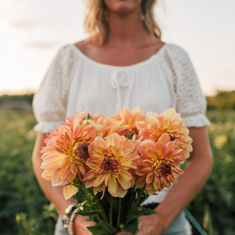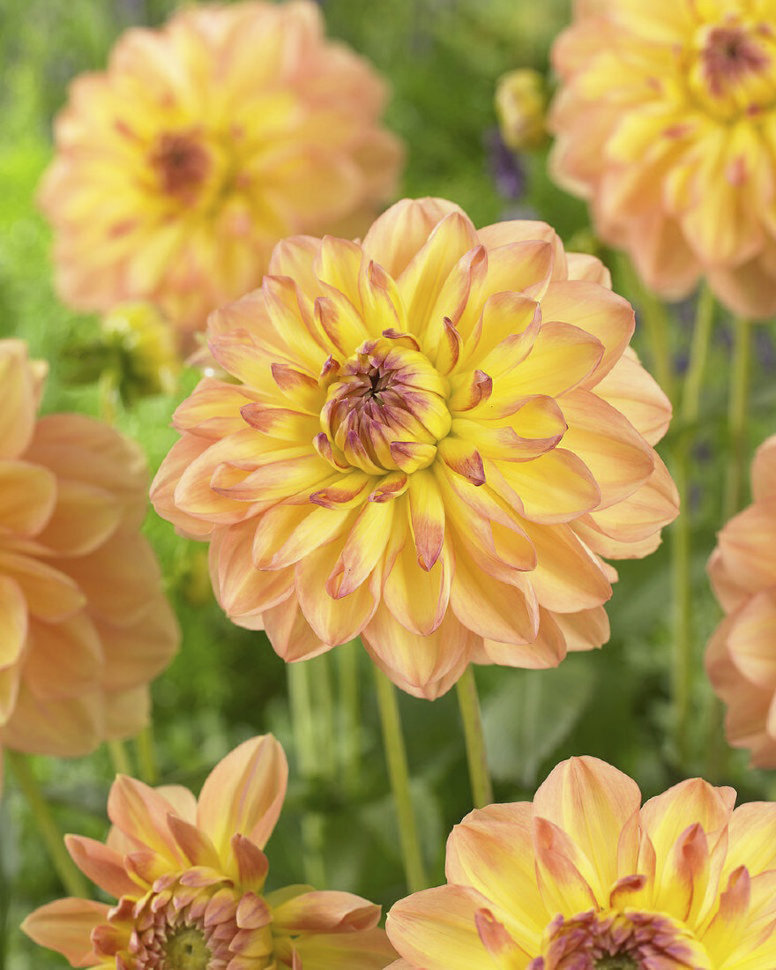 Сорт с нежной окраской: лепестки с переходом от основного солнечно-жёлтого оттенка к персиково-оранжевому цвету на краях. Яркий акцент бутонам придает сиренево-бордовый центр соцветий, образованный ко... Показать описаниенчиками еще не раскрывшихся лепестков. * Высота: 90-110 см * Диаметр цветка: 15 см Агротехника: Местоположение: солнечные, защищенные от холодных и сильных ветров места с хорошей циркуляцией воздуха. Нельзя высаживать их на низких и заболоченных участках. Расстояние при посадке зависит от высоты и формы куста того или иного сорта. Участок, выбранный для георгин, должен освещаться днем по крайней мере шесть часов. Почва: богатый перегноем жирный садовый суглинок, рН 6,5-6,7. Хороша для георгинов и удобренная песчаная почва. Участок, предназначенный под георгины, с осени вскапывают, а весной перекапывают. Посадочный материал обычно высаживают в грунт, когда минует угроза возвратных заморозков. В ямы размером 30 х 30 х 30 см, насыпают заранее подготовленный субстрат и комплексное минеральное удобрение. В зависимости от высоты, расстояние между растениями в ряду — 60–90 см. При правильной посадке корневая шейка должна быть на 2-3 см ниже уровня почвы. После посадки растения обильно поливают. Уход за георгинами несложный — обильный полив, мульчирование опилками слоем 6–9 см, подкормки и удаление лишних побегов. Для получения более крупных соцветий обычно удаляют пазушные побеги и выщипывают боковые бутоны. В октябре клубни выкапывают, предварительно обрезав стебли выше корневой шейки на 10–15 см. Клубни очищают от земли и подсушивают. Стебли укорачивают до 3–5 см. Посадочный материал закладывают в ящик с торфом и хранят при температуре от +2 до +6°С.