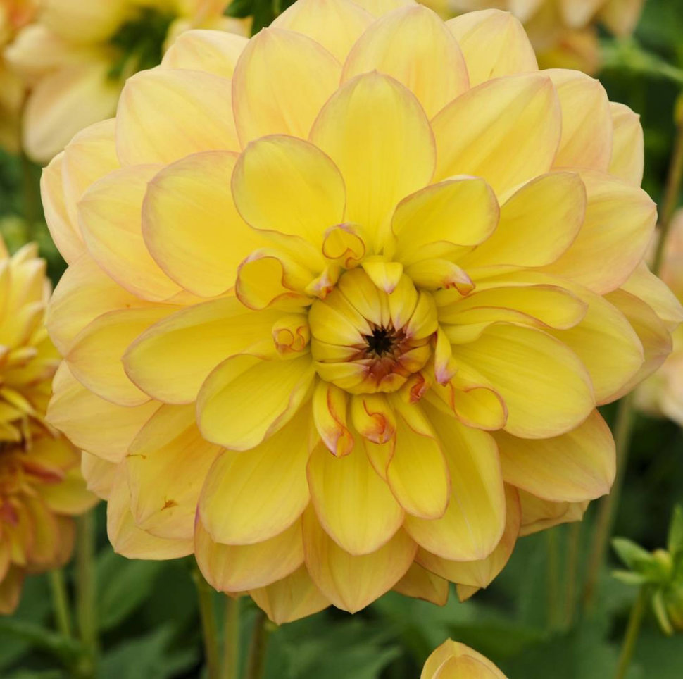 Этот сорт с необыкновенно изящными соцветями был представлен в США в 2013 году, и отмечен несколькими медалями на различных выставках! Наружные лепестки мягкого нежного желтого оттенка, а воротничковы... Показать описаниее затенены розовым. * Высота: 90-110 см * Диаметр цветка: 10 см Агротехника: Местоположение: солнечные, защищенные от холодных и сильных ветров места с хорошей циркуляцией воздуха. Нельзя высаживать их на низких и заболоченных участках. Расстояние при посадке зависит от высоты и формы куста того или иного сорта. Участок, выбранный для георгин, должен освещаться днем по крайней мере шесть часов. Почва: богатый перегноем жирный садовый суглинок, рН 6,5-6,7. Хороша для георгинов и удобренная песчаная почва. Участок, предназначенный под георгины, с осени вскапывают, а весной перекапывают. Посадочный материал обычно высаживают в грунт, когда минует угроза возвратных заморозков. В ямы размером 30 х 30 х 30 см, насыпают заранее подготовленный субстрат и комплексное минеральное удобрение. В зависимости от высоты, расстояние между растениями в ряду — 60–90 см. При правильной посадке корневая шейка должна быть на 2-3 см ниже уровня почвы. После посадки растения обильно поливают. Уход за георгинами несложный — обильный полив, мульчирование опилками слоем 6–9 см, подкормки и удаление лишних побегов. Для получения более крупных соцветий обычно удаляют пазушные побеги и выщипывают боковые бутоны. В октябре клубни выкапывают, предварительно обрезав стебли выше корневой шейки на 10–15 см. Клубни очищают от земли и подсушивают. Стебли укорачивают до 3–5 см. Посадочный материал закладывают в ящик с торфом и хранят при температуре от +2 до +6°С.