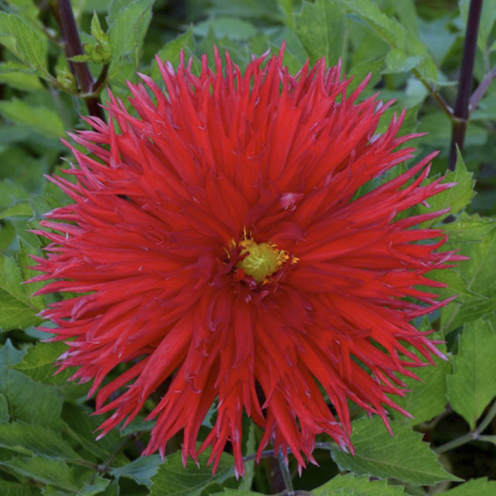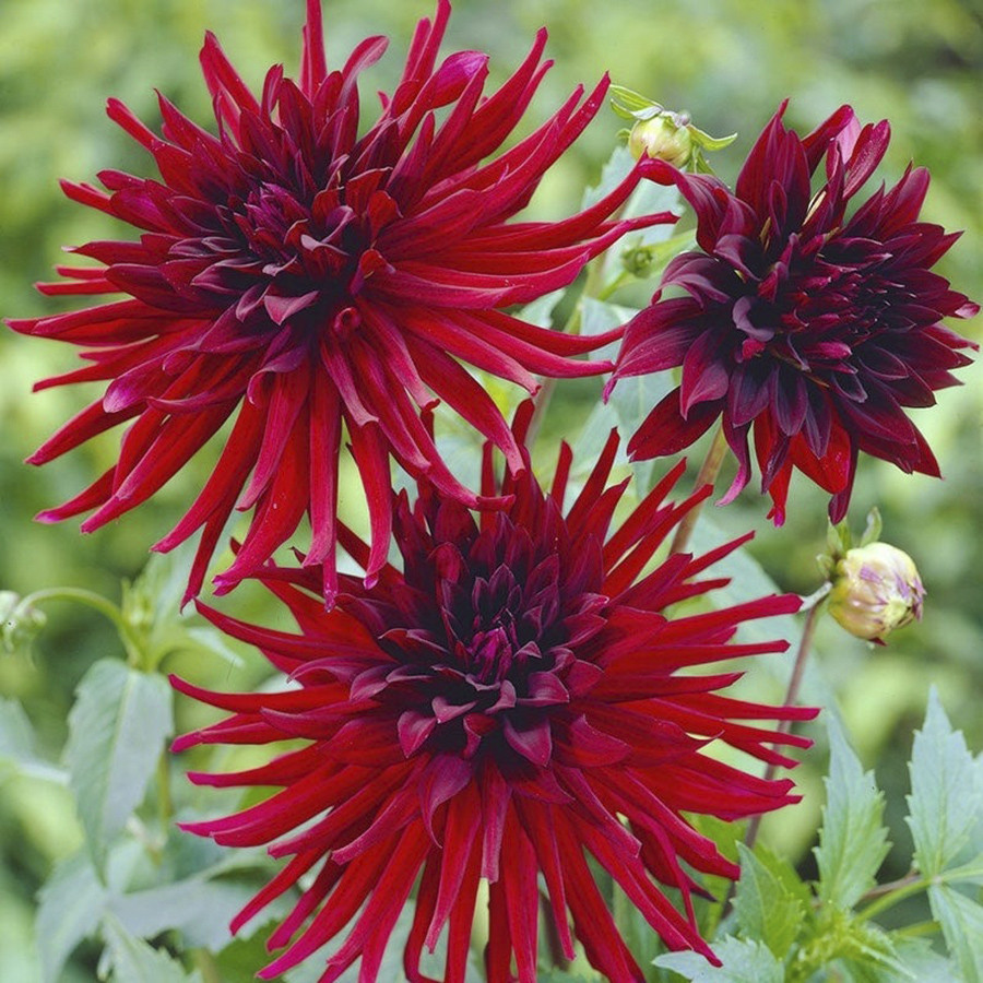 Один из самых популярных сортов георгин, выведен во Франции в 1970 году. Лепестки длинные, остроигольчатые, обладают тёмно-рубиновой окраской, ближе к серединке кажутся почти чёрными. Благодаря большо... Показать описаниему размеру цветков (до 20 см в диаметре) очень ценится во флористике. Хорошо смотрится в групповых посадках. * Высота: 100 см * Диаметр цветка: 15-20 см Агротехника: Местоположение: солнечные, защищенные от холодных и сильных ветров места с хорошей циркуляцией воздуха. Нельзя высаживать их на низких и заболоченных участках. Расстояние при посадке зависит от высоты и формы куста того или иного сорта. Участок, выбранный для георгин, должен освещаться днем по крайней мере шесть часов. Почва: богатый перегноем жирный садовый суглинок, рН 6,5-6,7. Хороша для георгинов и удобренная песчаная почва. Участок, предназначенный под георгины, с осени вскапывают, а весной перекапывают. Посадочный материал обычно высаживают в грунт, когда минует угроза возвратных заморозков. В ямы размером 30 х 30 х 30 см, насыпают заранее подготовленный субстрат и комплексное минеральное удобрение. В зависимости от высоты, расстояние между растениями в ряду — 60–90 см. При правильной посадке корневая шейка должна быть на 2-3 см ниже уровня почвы. После посадки растения обильно поливают. Уход за георгинами несложный — обильный полив, мульчирование опилками слоем 6–9 см, подкормки и удаление лишних побегов. Для получения более крупных соцветий обычно удаляют пазушные побеги и выщипывают боковые бутоны. В октябре клубни выкапывают, предварительно обрезав стебли выше корневой шейки на 10–15 см. Клубни очищают от земли и подсушивают. Стебли укорачивают до 3–5 см. Посадочный материал закладывают в ящик с торфом и хранят при температуре от +2 до +6°С.