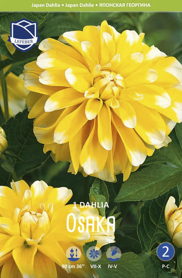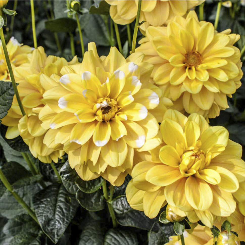 Цветки приятного жёлтого цвета с белыми кончиками поразительно изящно держатся на высоких стеблях. * Высота: 90 см * Диаметр цветка: 10 см Агротехника: Местоположение: солнечные, защищенные от холодны... Показать описаниех и сильных ветров места с хорошей циркуляцией воздуха. Нельзя высаживать их на низких и заболоченных участках. Расстояние при посадке зависит от высоты и формы куста того или иного сорта. Участок, выбранный для георгин, должен освещаться днем по крайней мере шесть часов. Почва: богатый перегноем жирный садовый суглинок, рН 6,5-6,7. Хороша для георгинов и удобренная песчаная почва. Участок, предназначенный под георгины, с осени вскапывают, а весной перекапывают. Посадочный материал обычно высаживают в грунт, когда минует угроза возвратных заморозков. В ямы размером 30 х 30 х 30 см, насыпают заранее подготовленный субстрат и комплексное минеральное удобрение. В зависимости от высоты, расстояние между растениями в ряду — 60–90 см. При правильной посадке корневая шейка должна быть на 2-3 см ниже уровня почвы. После посадки растения обильно поливают. Уход за георгинами несложный — обильный полив, мульчирование опилками слоем 6–9 см, подкормки и удаление лишних побегов. Для получения более крупных соцветий обычно удаляют пазушные побеги и выщипывают боковые бутоны. В октябре клубни выкапывают, предварительно обрезав стебли выше корневой шейки на 10–15 см. Клубни очищают от земли и подсушивают. Стебли укорачивают до 3–5 см. Посадочный материал закладывают в ящик с торфом и хранят при температуре от +2 до +6°С.