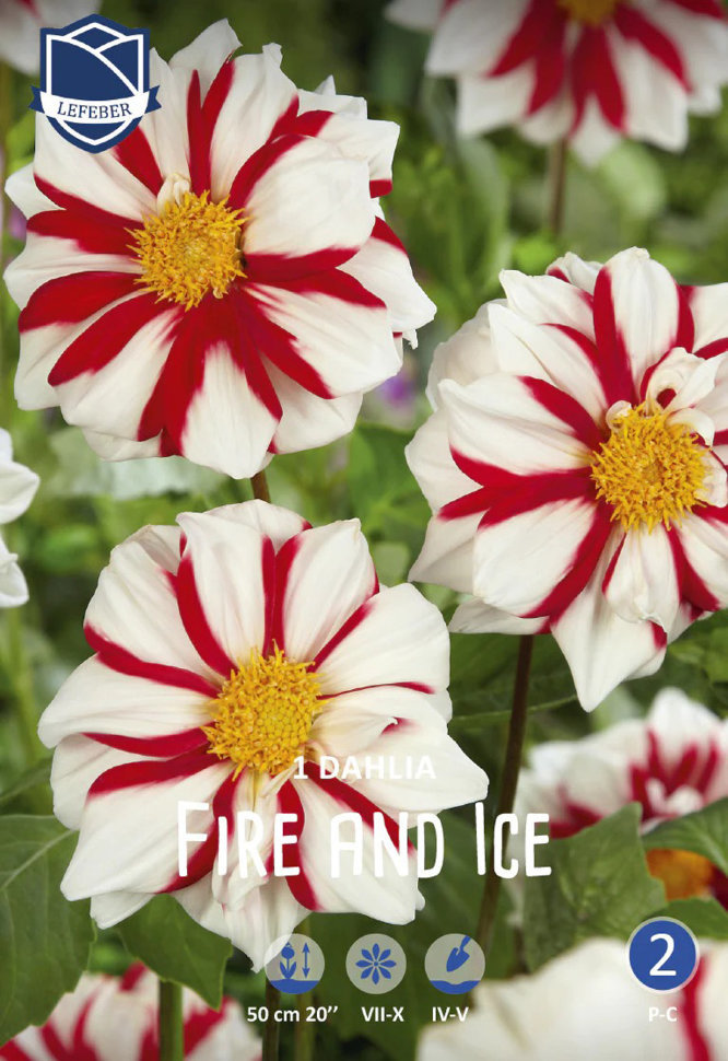 Георгина полностью оправдывает своё название — холодный, белоснежный цвет контрастирует с огненно-красным. Будто бы на лепестках в один миг затрещали язычки пламени! Невысокие стебли не ломаются, а кр... Показать описаниеупные для этого вида георгин цветки радуют обильным и продолжительным цветением. * Высота: 40-50 см * Диаметр цветка: 8-10 см Агротехника: Местоположение: солнечные, защищенные от холодных и сильных ветров места с хорошей циркуляцией воздуха. Нельзя высаживать их на низких и заболоченных участках. Расстояние при посадке зависит от высоты и формы куста того или иного сорта. Участок, выбранный для георгин, должен освещаться днем по крайней мере шесть часов. Почва: богатый перегноем жирный садовый суглинок, рН 6,5-6,7. Хороша для георгинов и удобренная песчаная почва. Участок, предназначенный под георгины, с осени вскапывают, а весной перекапывают. Посадочный материал обычно высаживают в грунт, когда минует угроза возвратных заморозков. В ямы размером 30 х 30 х 30 см, насыпают заранее подготовленный субстрат и комплексное минеральное удобрение. В зависимости от высоты, расстояние между растениями в ряду — 60–90 см. При правильной посадке корневая шейка должна быть на 2-3 см ниже уровня почвы. После посадки растения обильно поливают. Уход за георгинами несложный — обильный полив, мульчирование опилками слоем 6–9 см, подкормки и удаление лишних побегов. Для получения более крупных соцветий обычно удаляют пазушные побеги и выщипывают боковые бутоны. В октябре клубни выкапывают, предварительно обрезав стебли выше корневой шейки на 10–15 см. Клубни очищают от земли и подсушивают. Стебли укорачивают до 3–5 см. Посадочный материал закладывают в ящик с торфом и хранят при температуре от +2 до +6°С.
