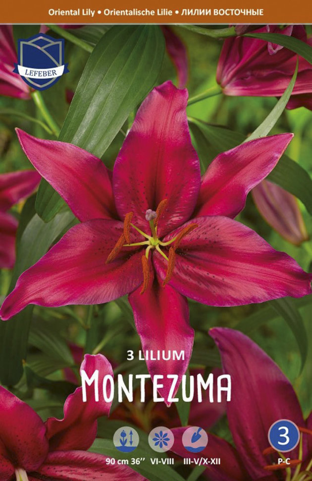 Этот сорт не зря назван в честь знаменитого вождя ацтеков - экзотические тёмно-бордовые цветки с рубиновым крапом и тонкой лавандовой каймой по краю лепестков вызывают невольное восхищение. Пожалуй, о... Показать описаниедин из самых смелых, ярких и запоминающихся восточных гибридов. Высота: 120-130 см Агротехника: Лилии выращиваются на одном месте (без пересадки) в течение 3-5 лет. Под посадку лилий выбирают места, хорошо защищенные от сильных ветров (однако хорошо проветриваемые), с солнечным местоположением или частичной полутенью. Почвы должны быть хорошо дренированные (лилии не выносят застоя воды в корнях), рыхлыми и плодородными. Перед посадкой почву обрабатывают на глубину 35-40 см, добавляют удобрения. Глубина посадки луковиц: * для низкорослых сортов (крупные луковицы) -10-12 см, с расстоянием между луковицами 15-20 см; * для среднерослых сортов (крупные луковицы) - 12-15 см, с расстоянием между луковицами 20-25 см; * для высокорослых сортов (крупные луковицы) - 15-20 см, с расстоянием между луковицами 25-30 см. Делают лунки, на дно которых насыпают песок, распределяют луковицы, присыпают корни небольшим количеством песка, и засыпают их почвой. Песок помогает уберечь луковицу от излишней влаги и инфекций, находящихся в земле. Участок с высаженными луковицами поливают. Последующий уход заключается в периодическом поливе (раз в 7-10 дней), подкормках и рыхлении почвы. В конце сезона цветоносы обрезают на уровне земли. Ежегодно осенью на участки с лилиями рекомендуется вносить хорошо перепревший компост. В районах с суровым климатом, посадки лилий укрывают лапником слоем 15-20 см. Весной, когда минует угроза заморозков, укрытие снимают.