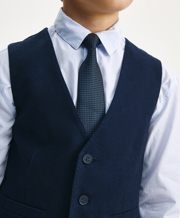 Синий укороченный жилет силуэта оверсайз с заниженной линией плеч – стильная акцентная деталь школьного гардероба. Жилет выполнен  из плотного мягкого текстиля, имеющего гладкую поверхность ... Показать описаниес легким матовым блеском. Крупные накладные карманы с клапанами, воротник стойка придают жилету динамику и драйв, делают его ярким образцом модели, отражающей острые современные тренды осени. Жилет застегивается на металлическую молнию в цвете темный никель, поддержанную небольшой брендированной металлической табличкой на клапане. Шелковистая подкладка способствует комфортному взаимодействию с изделиями первого слоя. Жилет легко комбинируется с блузками, водолазками, свитшотами, худи. И с юбками, и с брюками разной посадки и формы, жилет составит стильные школьные комплекты, подчеркивающие модные пропорции в образе. верх 52% хлопок,45% полиэстер,3% эластан; подкладка 53% вискоза,47% полиэстер