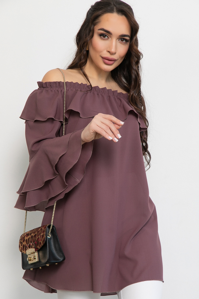 Состав: Креп шифон (п/э-61%; вискоза-39%) Описание Туника “Амалия” – это идеальный выбор для стильных женщин. Простая, базовая и одновременно нарядная, она перенесет вас в атмосферу легкости и свободы. её нежное прикосновение к коже превратит любой день в праздник моды и стиля. Кофточка с открытыми плечами идеально подходит как для повседневного образа, так и для  вечернего.  Благодаря длинным рукавам и открытым плечам, эта блуза выгодно подчеркнет вашу женственность, а рюши добавят объемности и создаст прекрасный силуэт.  Позвольте себе выглядеть строго без потери женственности!