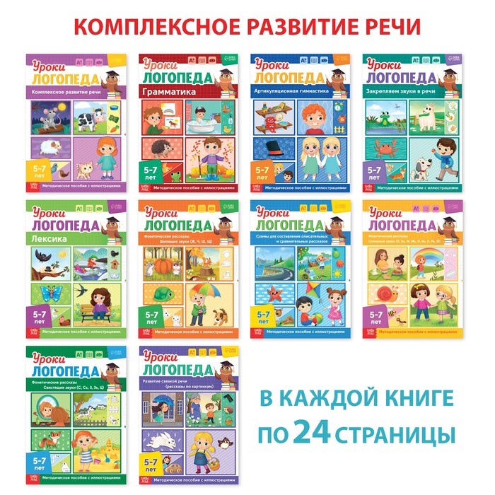 * Набор «Уроки логопеда» — это полноценное дидактическое пособие для педагогов, которое поможет улучшить качество речи у детей. Что внутри: * упражнения на развитие речи; * задания на развитие мышления и памяти; * упражнения на развитие внимания и координации работы обоих полушарий мозга. Особенности книги * Формат — А4. * Мягкий переплёт, в каждой книге по 24 страницы. * Рекомендована для детей от 5 лет. Набор «Уроки логопеда» содержит десять книг: 1. «Артикуляционная гимнастика». 2. «Грамматика». 3. «Закрепляем звуки в речи». 4. «Комплексное развитие речи». 5. «Лексика». 6. «Схемы для составления относительных и сравнительных рассказов». 7. «Развитие связной речи (рассказы по картинкам)». 8. «Фонетические рассказы. Свистящие звуки (С, С’ З, З’, Ц)». 9. «Фонетические рассказы. Сонорные звуки (Л, Л’, М, М’, Н, Н’, Р, Р’, Й)». 10. «Фонетические рассказы. Шипящие звуки (Ж, Ч, Ш, Щ)». Комплектация * «Уроки логопеда. Комплексное развитие речи», 24 стр.</9403868/> * Книга «Уроки логопеда. Лексика», 24 стр.</9403869/> * Книга «Уроки логопеда. Развитие связной речи», 24 стр.</9403870/> * Книга «Уроки логопеда. Схемы для составления рассказов», 24 стр.</9403871/> * Книга «Уроки логопеда. Фонетические рассказы (свистящие звуки)», 24 стр.</9403872/> * Книга «Уроки логопеда. Фонетические рассказы (сонорные)», 24 стр.</9403873/> * Книга «Уроки логопеда. Фонетические рассказы (шипящие звуки)», 24 стр.</9403874/> * Книга «Уроки логопеда. Артикуляционная гимнастика», 24 стр.</9403875/> * Книга «Уроки логопеда. Грамматика», 24 стр.</9403876/> * Книга «Уроки логопеда. Закрепляем звуки в речи», 24 стр.</9403867/>