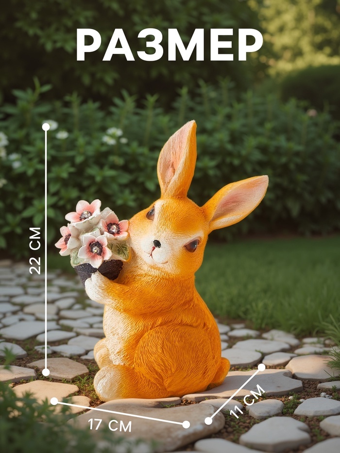 Очаровательная садовая фигура «Зайка с букетом» из полистоуна - милое украшение для вашего участка. Яркая оранжевая фигурка высотой 22 см с детализированным букетом цветов создает уютную атмосферу. Встроенная подсветка обеспечивает мягкое жёлтое свечение в вечернее время. Преимущества * Яркий акцент - оранжевый цвет и милый дизайн привлекают внимание * Экономия энергии - работает от солнечной батареи без дополнительных расходов * Компактные размеры - 22?11?17 см идеально подходят для небольших участков * Уютная подсветка - желтое свечение создает теплую атмосферу * Простота ухода - достаточно периодически протирать влажной тканью * Доступная цена - отличное сочетание качества и стоимости * Легкий вес - удобно переносить и менять расположение Рекомендации * Используйте в сухую погоду * Убирайте на хранение при температуре ниже 0°C * Включайте подсветку вручную при необходимости «Зайка с букетом» - это простое и очаровательное украшение для вашего сада. Милая днем и яркая вечером, она создаст атмосферу тепла и уюта без лишних хлопот. Выбирайте милый и практичный декор, который будет радовать вас весь сезон!