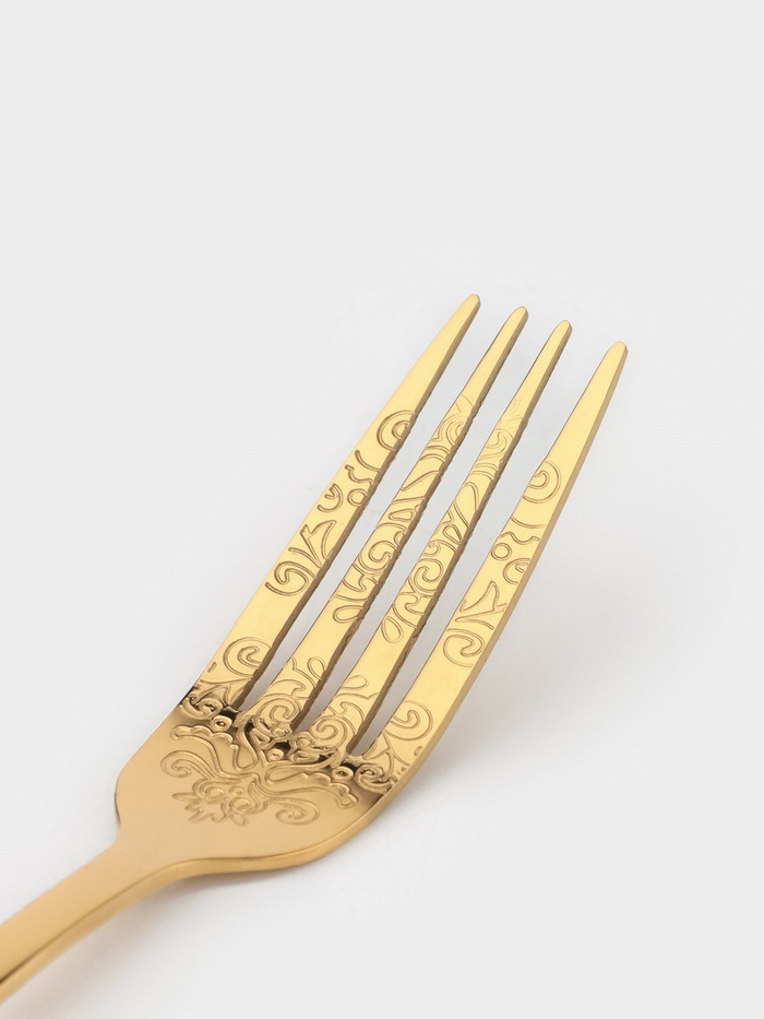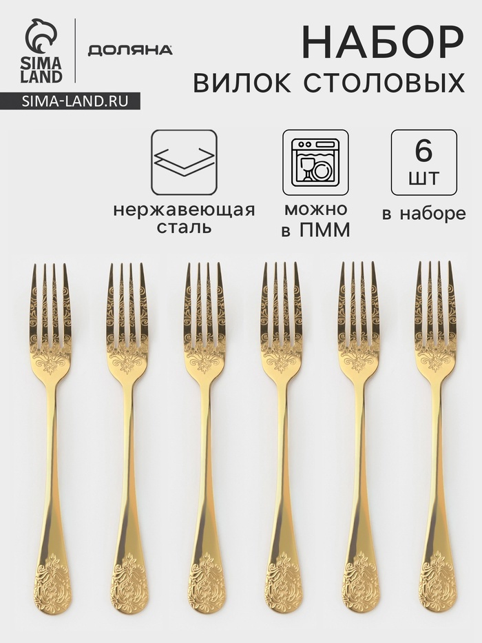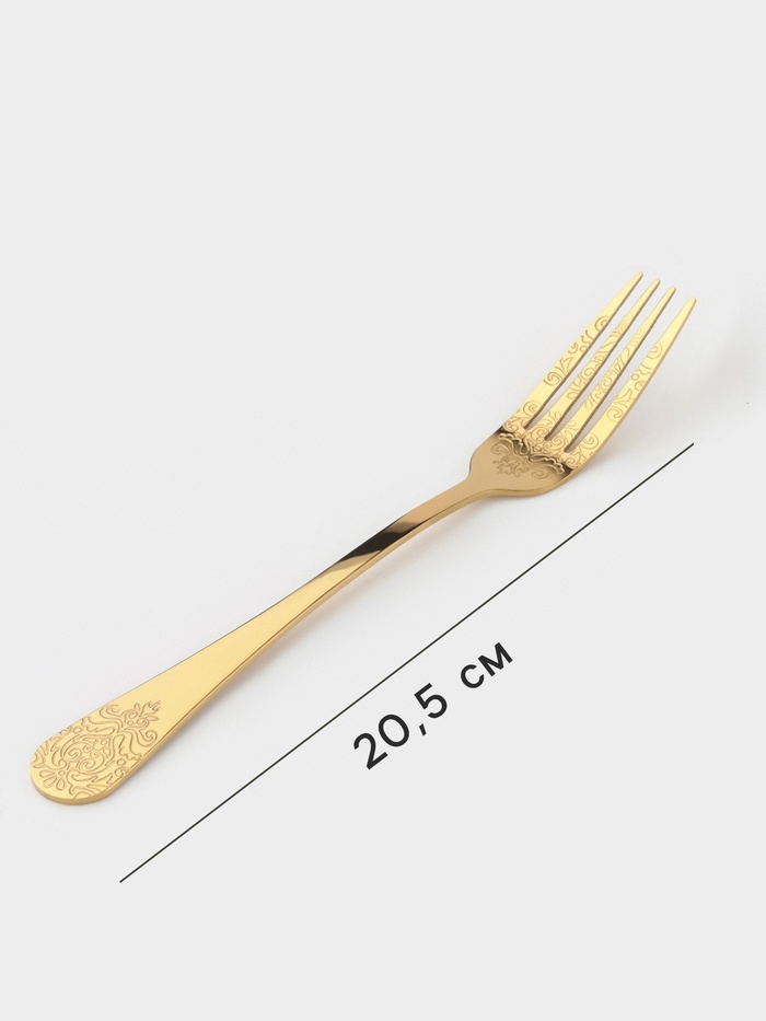 Элегантная простота для сервировки. Набор столовых вилок из нержавеющей стали — это идеальное сочетание функциональности и лаконичного дизайна. Вилки подходят как для повседневного использования, так и для торжественных мероприятий, сохраняя безупречный внешний вид. Особенности: * Набор из 6 шт.: универсальное количество для сервировки стола на семью или гостей. Каждая вилка имеет длину 20,5 см, что делает её удобной для горячих блюд, салатов и гарниров. * Нержавеющая сталь: материал устойчив к коррозии, не темнеет со временем и не впитывает запахи. * Изящный декор: лаконичный узор придаёт набору утончённый вид, не утяжеляя дизайн. Золотистый оттенок гармонично сочетается с классической и современной посудой * Удобство в уходе: вилки можно мыть в посудомоечной машине — они не теряют блеск даже после многих циклов мойки. Набор вилок — это надёжный выбор для тех, кто ценит долговечность и эстетику. Стильные и практичные вилки станут незаменимыми помощниками на кухне и украшением любого стола. Дополнительно Можно мыть в посудомоечной машине в щадящем режиме, без использования агрессивных моющих средств.