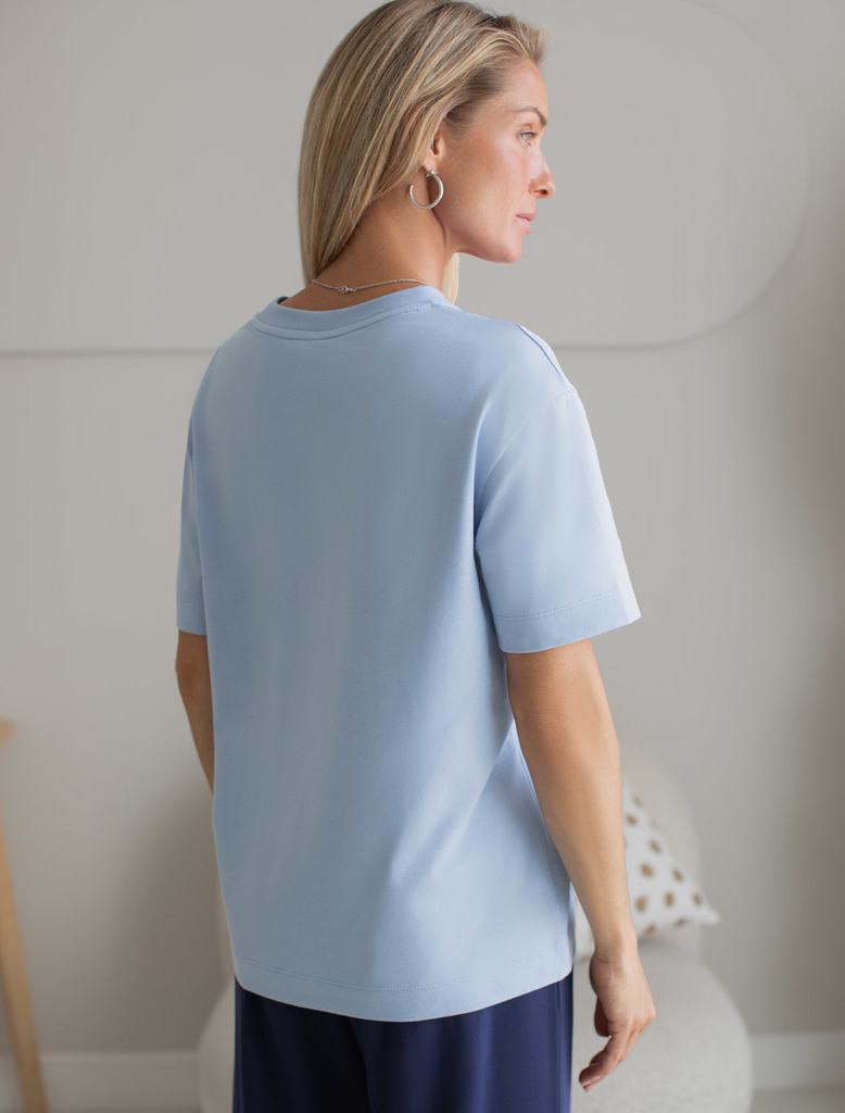 Состав: 92%Хлопок 8%ПУ Плотность: 170 Г/м2 Размер товара на первом фото: 42 Футболка нежного голубого цвета изготовлена из премиального хлопка с эластаном, она обеспечивает невероятное ощущение уюта и легкости. Натуральный материал сохраняет форму и цвет после множества стирок, обеспечивая долговечность изделия, а его высокая воздухопроницаемость создает ощущение свежести даже в течение долгого дня. Особое внимание привлекает стильный принт в виде бабочки с цветами. Принт выполнен красками с устойчивым покрытием, который добавляет изделию оригинальности и позволяет выразить индивидуальность. Свободный крой футболки дарит удобство и не стесняет движений, что делает ее идеальной для повседневной носки или активного отдыха, подчеркивает современный взгляд на моду. На рукаве металлический логотип бренда. Подойдет девушкам и женщинам на любую фигуру, вы будете чувствовать себя в ней уверенно и комфортно. Отлично впишется в гардероб благодаря универсальному дизайну, который легко сочетать с джинсами, шортами или спортивными брюками.