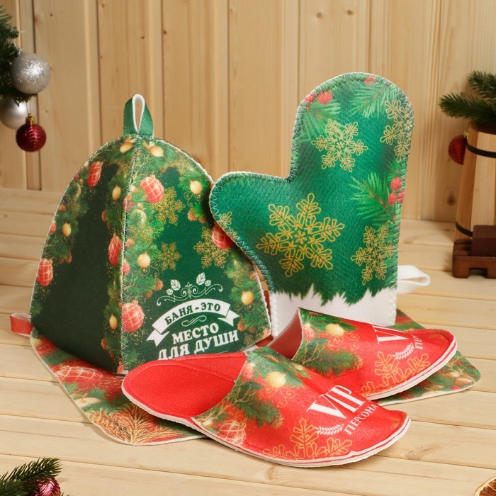 Подарочный набор «VIP баня» в комплекте из 4 предметов — это продуманный комплект аксессуаров для ценителей пара и тактильных ощущений. Каждая вещь в наборе выполняет свою функцию, делая банные процедуры комфортными, безопасными и по-настоящему традиционными. * Полный комплект для бани: в набор входят все необходимые аксессуары: шапка для защиты волос и ушей от перегрева, рукавица для массажа и безопасного обращения с горячими предметами, банный коврик для комфортного стояния и тапочки. Все продумано до мелочей. * Натуральные материалы: комбинация шерсти и полиэфира в производстве обеспечивает главные для бани свойства: материал хорошо впитывает влагу, быстро сохнет, долго служит и не вызывает раздражения на коже. Ощущения от прикосновения — как от традиционных натуральных материалов. * Универсальный подарок: набор подойдет и мужчине, и женщине — классический дизайн без лишних деталей делает его уместным презентом для любого человека, ценящего банную культуру. Это решение для тех, кто ищет практичный и тематический подарок. * Праздничный стиль: комплект оформлен в стилистике Нового года — его можно сразу вручать без дополнительной упаковки. Такой презент говорит о внимании к деталям и заботе о комфорте того, кто его получает. Польза и традиции: каждый предмет в наборе несет в себе пользу и многовековые традиции банного искусства. Шапка защищает от перегрева, рукавица помогает создать правильный пар, коврик и тапочки обеспечивают гигиену и безопасность. Это подарок, который создает настроение и заботится о самочувствии. Преподнесите близкому человеку не просто вещи, а готовый ритуал оздоровления и релаксации.