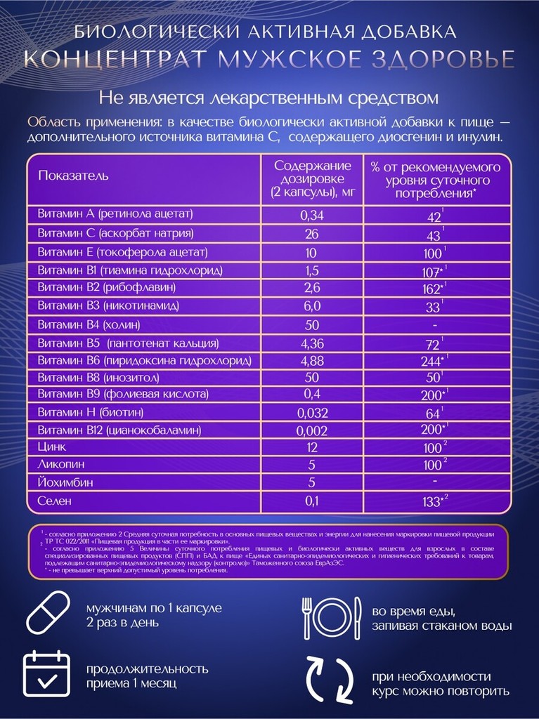 Какой мужчина не хочет в любом возрасте чувствовать себя сильным, молодым и активным. Концентрат Мужское здоровье поможет каждому мужчине почувствовать силу и бодрость, предотвратит возможные заболевания и продлит молодость. Входящие в состав Концентрата компоненты способствуют поддержанию функционального состояния мужской репродуктивной системы, повышению работоспособности, физической силы и выносливости. Концентрат способствует ежедневному восполнению дефицита важных витаминов и микроэлементов, повышению иммунной защиты, поддержанию активности в период повышенных физических и умственных нагрузок, защите от воздействия свободных радикалов, лучшему метаболизму глюкозы и белков, что позволяет поддержать желаемую физическую форму. Концентрат Мужское здоровье содержит основные витамины, микроэлементы и натуральные экстракты для поддержания мужского организма, имеет удобную форму приема, натуральный состав без красителей, не вызывает аллергии. Концентрат Мужское здоровье разработан по оригинальной рецептуре и не имеет аналогов, прошел государственную регистрацию, что подтверждает его качество, эффективность и безопасность.