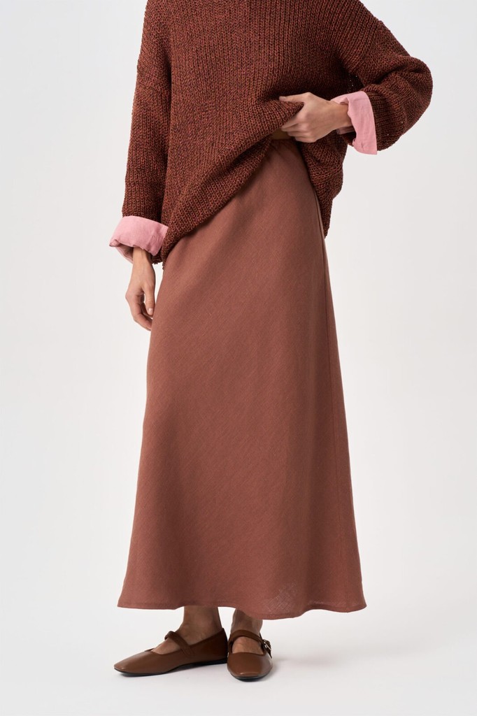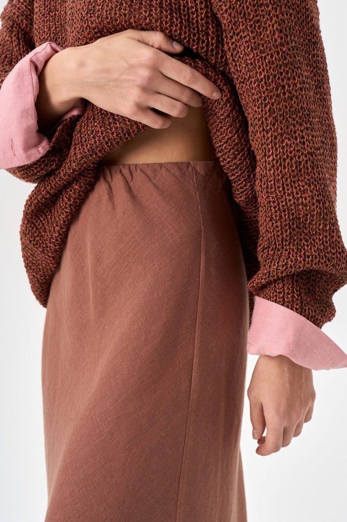 Цвет: корица Описание Состав: 100% льняная ткань. Юбка длинная коническая косого кроя. Пояс цельнокроеный с декоративной строчкой по резинке. Модель разработана на рост 164-170 см. Параметры модели: рост – 172 см, ОГ – 84 см, ОТ – 60 см, ОБ – 90 см. На модели 42 размер.