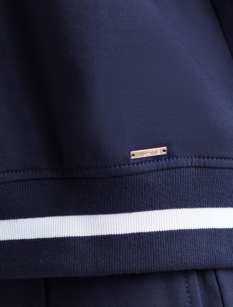 Состав: 95%Хлопок 5%ПУ Плотность: 240 Г/м2 Параметры модели на первом фото: Рост 172, бюст 88, талия 64, бедра 88 Размер товара на первом фото: 42 Свитшот темно-синего цвета среднего объема с V вырезом выполнен из футера двухнитки с эластаном плотностью 240 Г/м2. Натуральный хлопок обеспечивает мягкость и оптимальный теплообмен весной и летом. Нежный материал дарит ощущение уюта, а премиальное качество изготовления гарантирует долговечность и сохранение формы после множества стирок. Особенность свитшота - контрастные полосы на горловине, манжетах и поясе, которые добавляют современный акцент и делают образ более выразительным. Аккуратная вышивка в виде логотипа бренда, расположенная на груди, придает свитшоту индивидуальности без лишней вычурности. Представлена широкая размерная линейка, включая маленькие и большие размеры, что позволяет подобрать идеальный вариант для разной фигуры .Этот уютный свитшот отлично подходит для повседневной носки благодаря своей комфортной посадке и нежной текстуре. Свободный джемпер из футера станет идеальным выбором для активного отдыха, обеспечивая стильный внешний вид и удобство. Рекомендуем сочетать с артикулами: D44.168, D46.059, D49.171