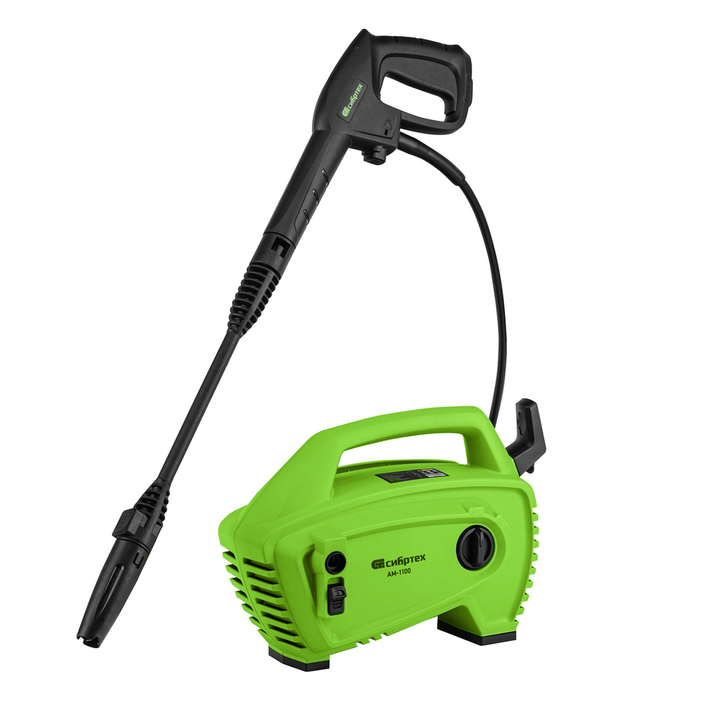 Переносная моечная машина высокого давления Сибртех AM-1100 58223 мощностью 1100 Вт и производительностью 280 л/ч подает струю воды под давлением 90 бар. Позволяет быстро очистить садовые дорожки, забор, стены строений, садовый инвентарь, уличную мебель, кузов автомобиля. Машина подключается к водопроводу, а также способна работать в режиме самовсасывания — в этом случае в качестве источника воды можно использовать любую емкость. Устройство будет полезно владельцам дачных участков.ПреимуществаВысокий ресурс — алюминиевая помпа выдерживает интенсивное использование.Экологичность — во время работы машины отсутствуют вредные выхлопы и неприятный запах.Термозащита — в случае перегрева двигатель отключается для предотвращения поломки.Электробезопасность — токопроводящие элементы имеют двойную изоляцию.Удобная регулировка струи — вращая корпус сопла, можно установить оптимальный вид распыления.Эффективное очищение — в комплект поставки входит внешний пеногенератор, позволяющий использовать моющие средства.Удобная работа в труднодоступных местах — на пистолет можно установить насадку-удлинитель.Безопасность — блокировка рычага пистолета предотвращает случайный запуск.Защита от засоров — входной штуцер имеет встроенный фильтр, задерживающий посторонние частицы.Легкая подготовка к работе — быстросъемный адаптер позволяет подключить входной шланг одним движением.Свободное передвижение по рабочей зоне — длина сетевого кабеля и шланга составляет 5 м, что позволяет реже перемещать мойку во время работы.Простое обслуживание — в комплект поставки входит игла для прочистки сопла.Продуманное хранение и транспортировка — на корпусе имеется удобная ручка, предусмотрены специальные кронштейны для кабеля и шланга.