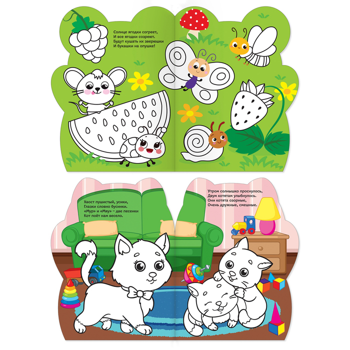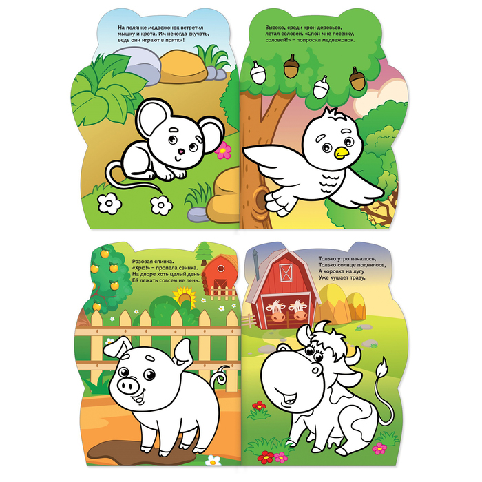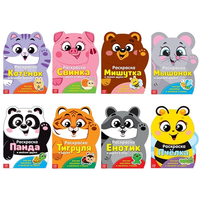 Раскраски с наклейками — это двойное удовольствие для ребёнка! Малыш познакомится с милыми персонажами и раскрасит все картинки. Расскажите ребёнку о животных, птичках, фруктах и растениях и разучите стихи о них. В набор входят 8 раскрасок разной тематики: * «Котёнок», * «Свинка», * «Мишутка», * «Мышонок и весёлые друзья», * «Панда», * «Тигруля», * «Енотик», * «Пчёлка». Страницы бумажные, наклейки не многоразовые. Переплёт мягкий, глянцевый, приятный на ощупь. Издания направлены на развитие мелкой моторики рук, внимания, памяти, речи, слуха, зрительного восприятия и воображения. Книги рекомендованы детям старше 1 года. Развивайтесь вместе с нами! Комплектация * Раскраска с наклейками «Котёнок», 12 стр.</2852966/> * Раскраска с наклейками «Свинка», 12 стр.</2852962/> * Раскраска с наклейками «Мишутка», 12 стр.</2852963/> * Раскраска с наклейками «Мышонок и весёлые друзья», 12 стр.</4482551/> * Раскраска с наклейками «Панда», 12 стр.</2852964/> * Раскраска с наклейками «Тигруля», 12 стр.</2852965/> * Раскраска с наклейками «Енотик», 12 стр.</2852967/> * Раскраска с наклейками «Пчёлка», 12 стр.</2852969/>